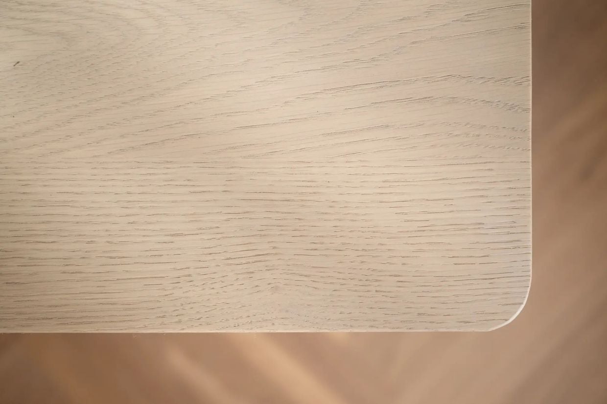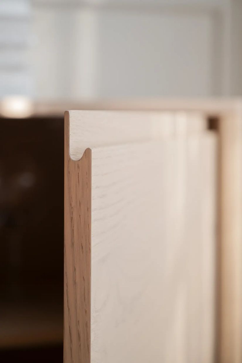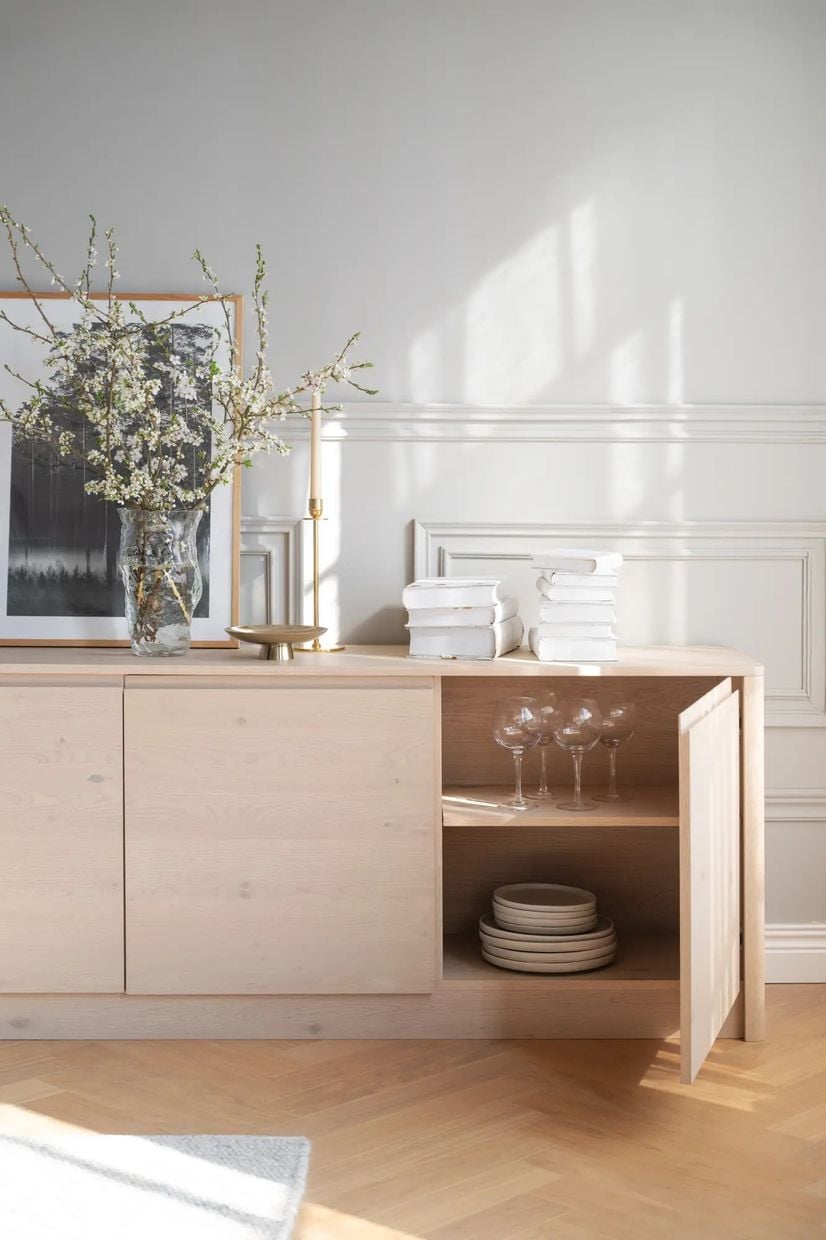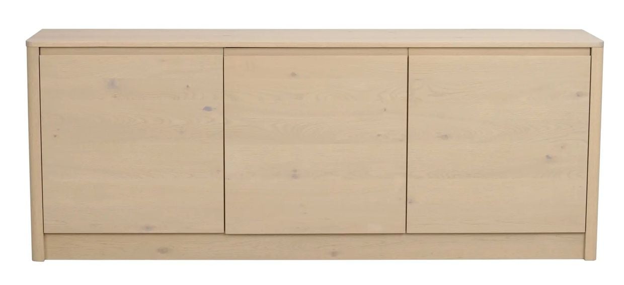 Sideboardet Melstone i vitpigmenterad FSC®-certifierad vildek är en möbel med stark hantverkskänsla och vackert rundade former. Designen bygger på en och samma planka från trädet över hela fronten, vilket ger en naturligt sammanhängande träbild och ett harmoniskt uttryck. Det infrästa handtaget i massivt trä är både diskret och elegant, en genomtänkt detalj som förstärker möbelns exklusiva känsla. Melstone står på en sarg, vilket lyfter möbeln visuellt och ger en lätt och luftig siluett trots sin generösa förvaringskapacitet. De fanerade ytorna, tillsammans med de rundade hörnen och den mjuka ytbehandlingen i vildek, bidrar till ett varmt och inbjudande uttryck.