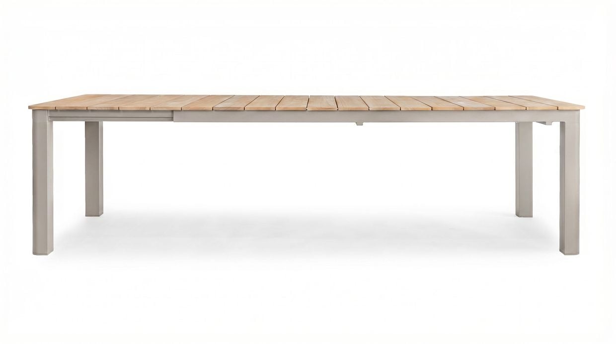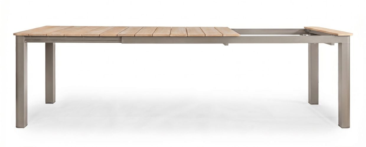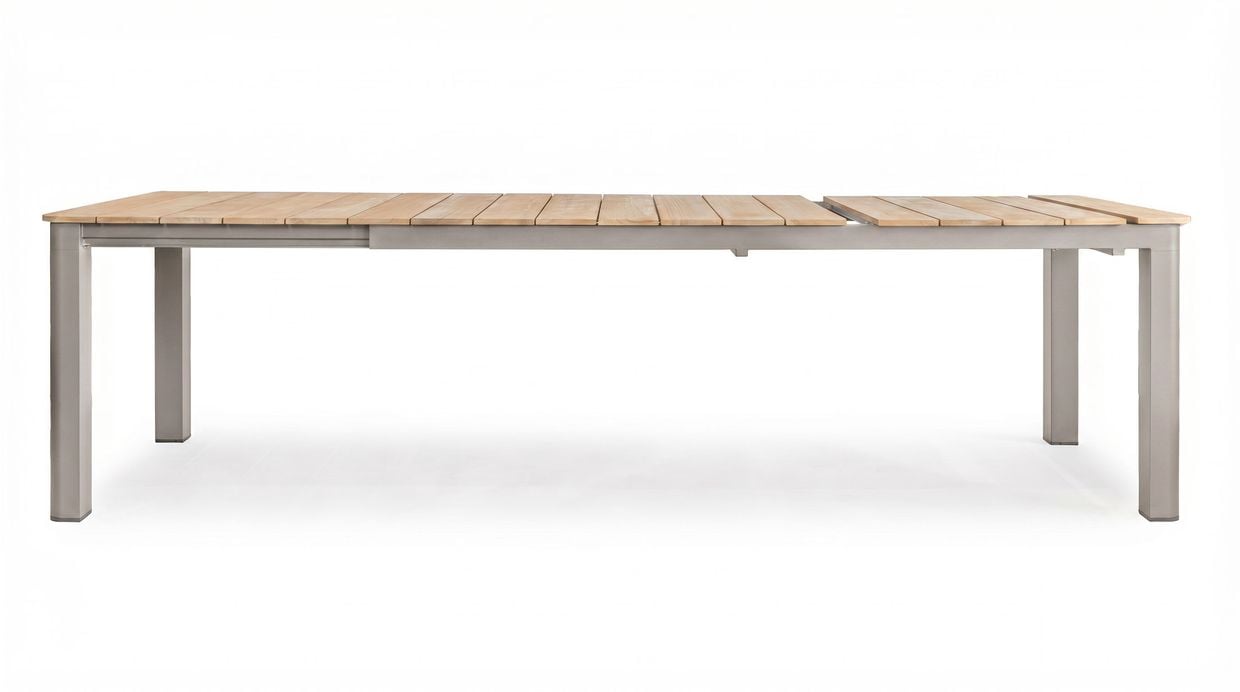 Montclair-bordet är designat för att anpassa sig efter dina behov. I sitt kompakta läge är det 216 cm långt och erbjuder gott om plats för upp till tre stolar per sida. Bordet har en sömlös toppskiva i teak av hög kvalitet (grad B), där inga skarvar syns – vilket ger ett exklusivt och gediget uttryck. När fler gäster ska få plats förlängs bordet enkelt genom att dra i ena sidan. Benen följer med ut för bibehållen stabilitet och den smart förvarade iläggsskivan under bordet läggs smidigt på. Fullt utdraget mäter bordet 277 cm och rymmer då fyra stolar per sida.
