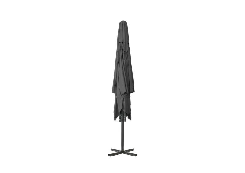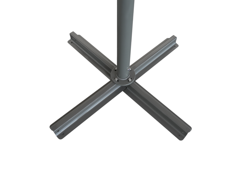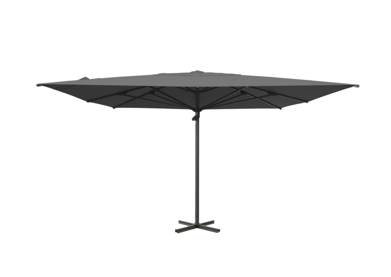 Denna stora fyrkantiga parasoll (4x4 m) har ventilationsöppning och duk av 300-grams genomfärgad polyester med vattenavvisande beläggning. Parasollen behöver förankras, och en bas med kors och bultar ingår (vikter säljs separat).
