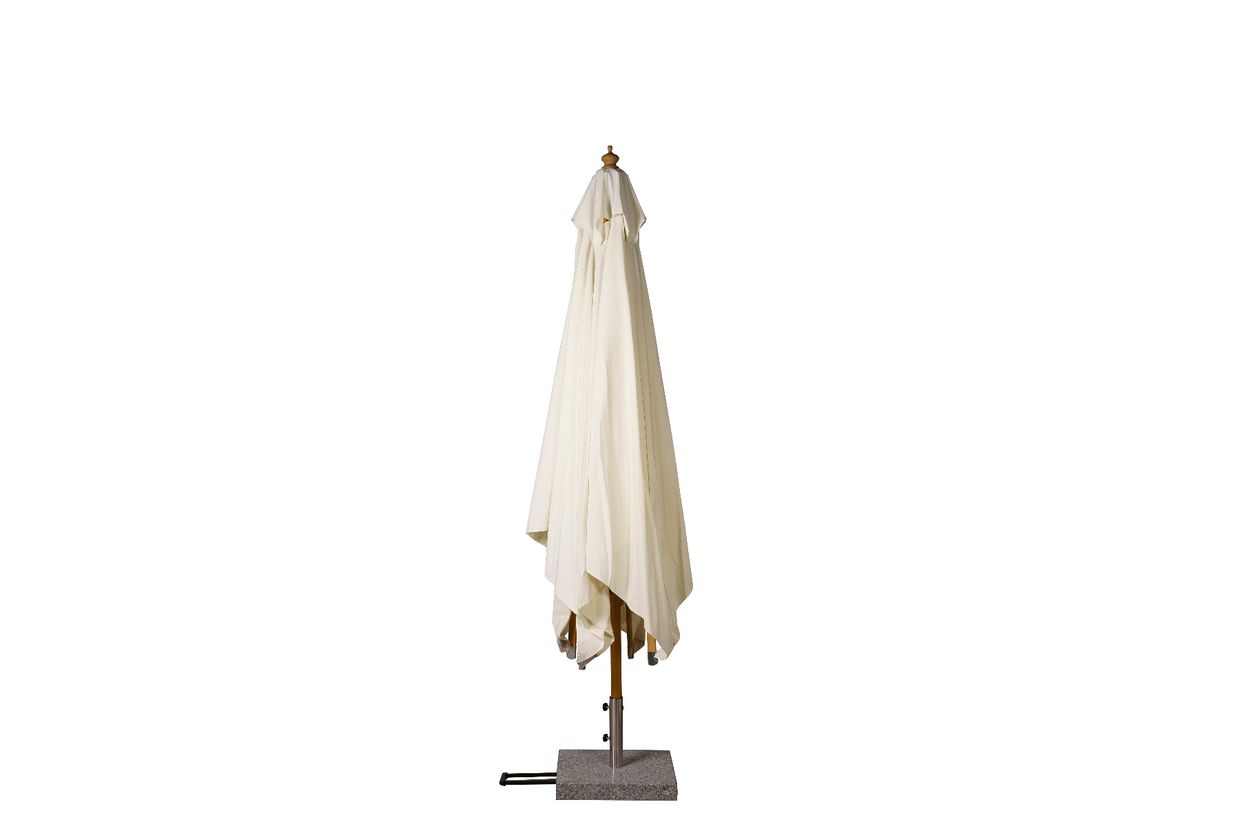 Kvadratiskt parasoll 3x3m med stomme i trä och ecrufärgat polyestertyg.
