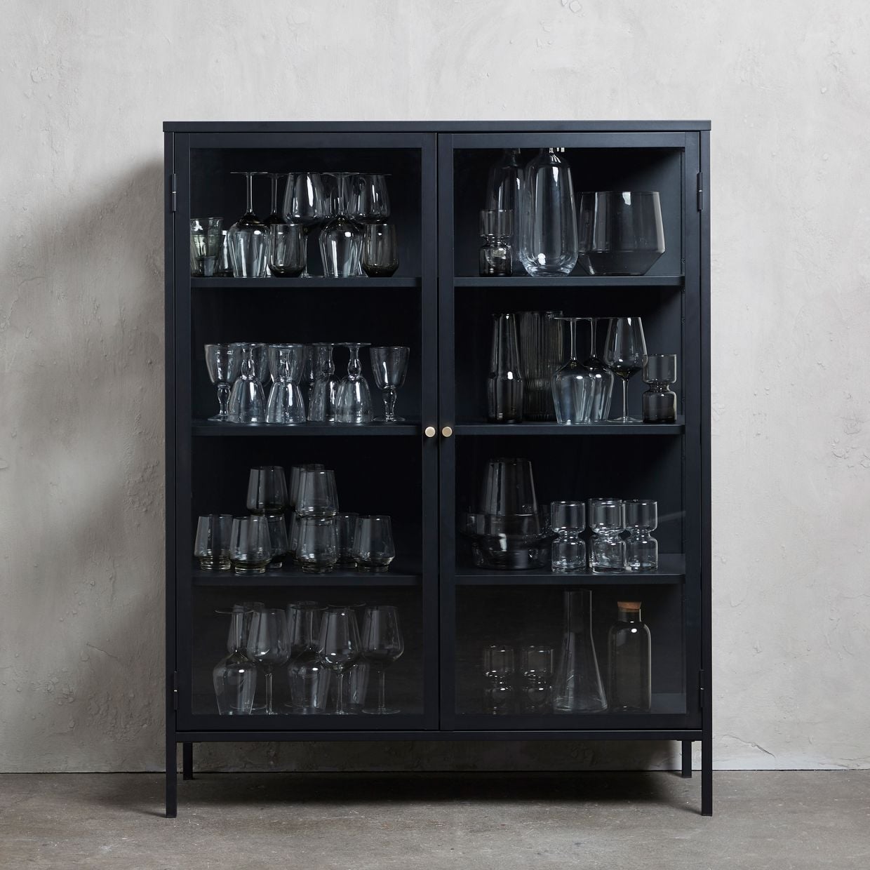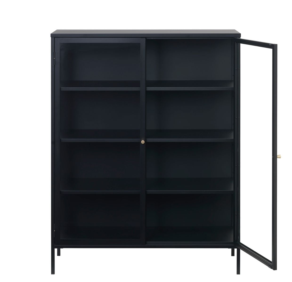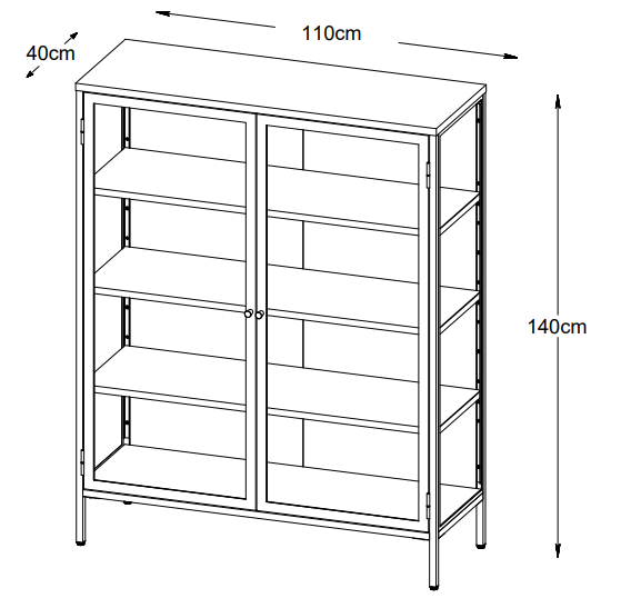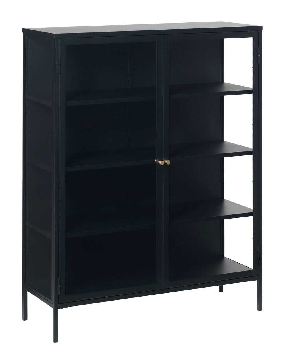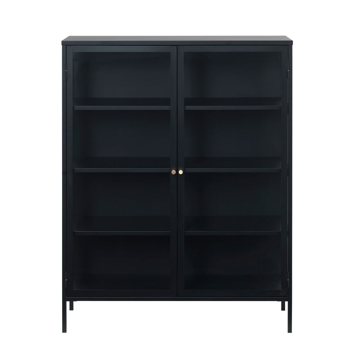Material: svartmålat metall med härdade glasdörrar och två guldfärgade metallhandtag.