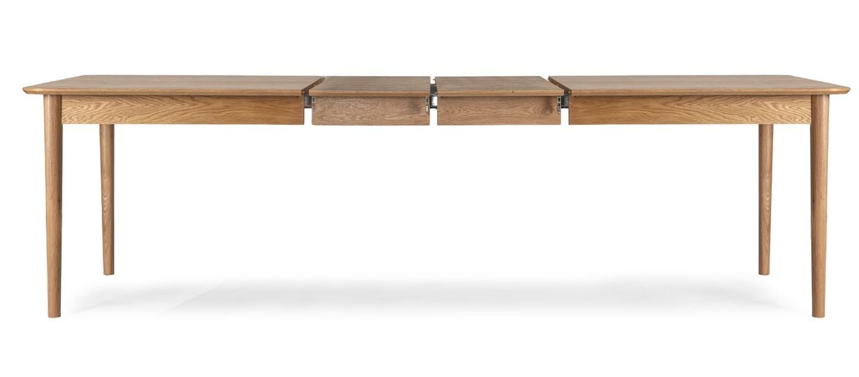 Med sina utdragsskivor kan Oskar enkelt anpassas efter behov. Utan klaffar mäter bordet 180 cm – perfekt för vardagen. Med en klaff förlängs bordet till 220 cm och med båda klaffarna i får du hela 260 cm, vilket ger plats för upp till fyra extra stolar.