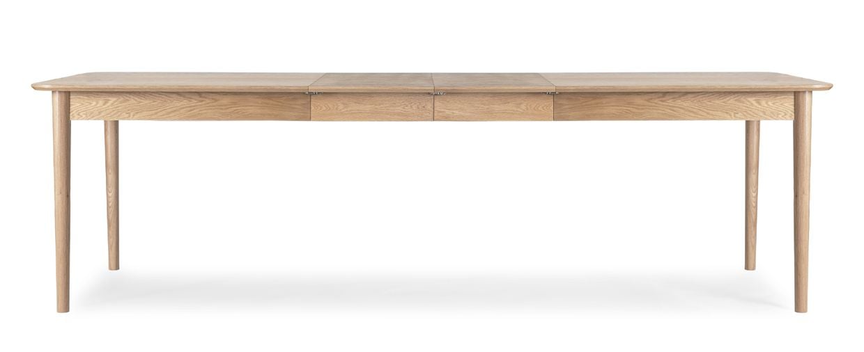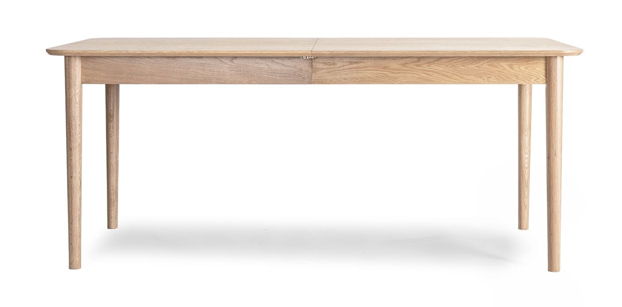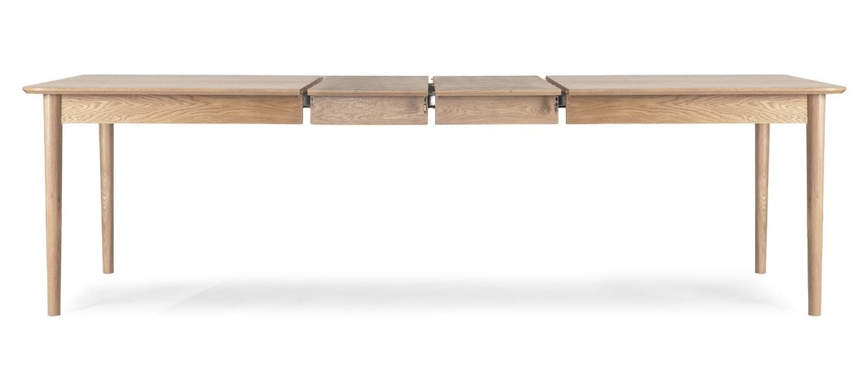 Med sina utdragsskivor kan Oskar enkelt anpassas efter behov. Utan klaffar mäter bordet 180 cm – perfekt för vardagen. Med en klaff förlängs bordet till 220 cm och med båda klaffarna i får du hela 260 cm, vilket ger plats för upp till fyra extra stolar.
