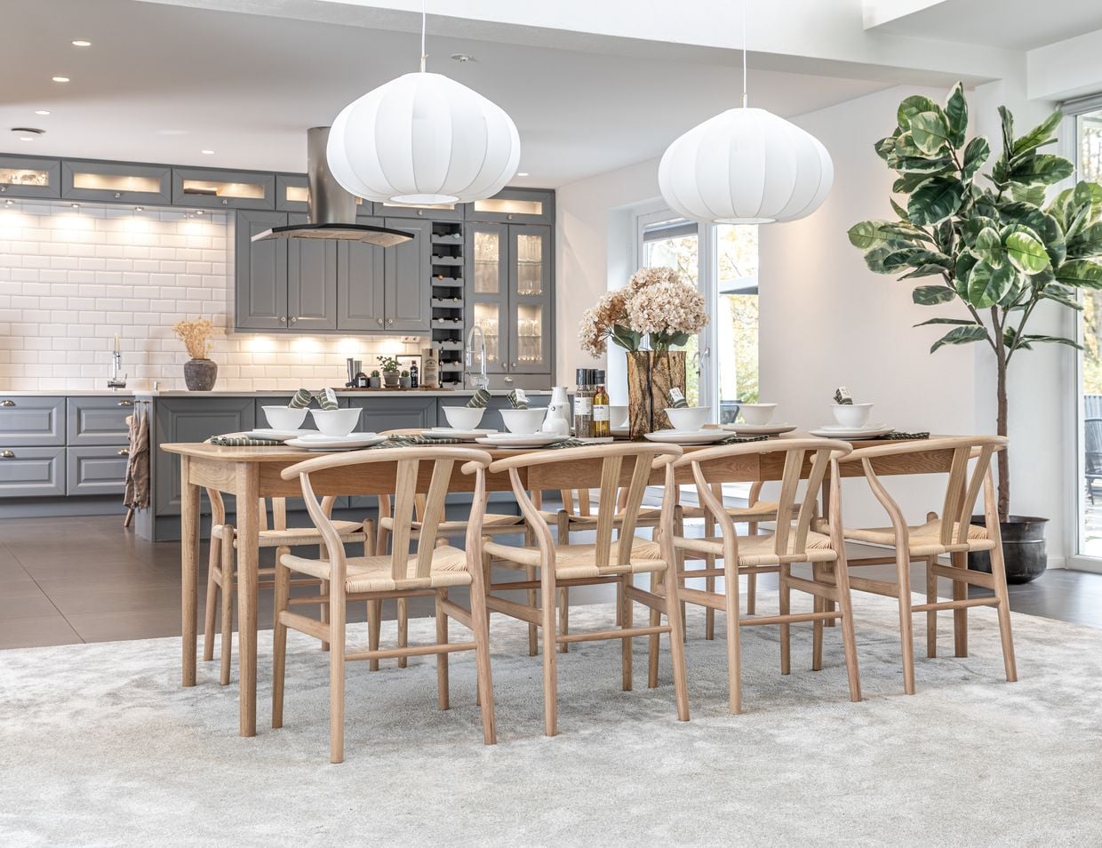 Till bordet hör den lika stilrena Oskar-stolen, vars harmoniska linjer och sits i naturmaterial skapar både estetisk balans och hög komfort. Kombinationen av naturliga trädetaljer och hantverksmässigt utförande ger en varm, modern och exklusiv känsla som passar lika bra i det luftiga köket som i det eleganta matsalsrummet.