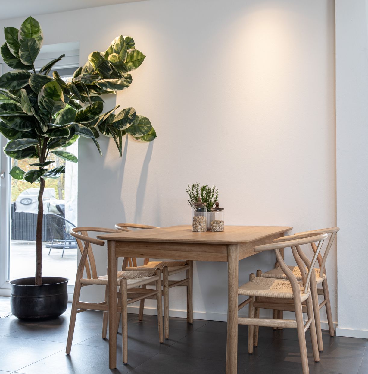 • Naturliga material som ek och korgsnöre skapar en varm och inbjudande atmosfär