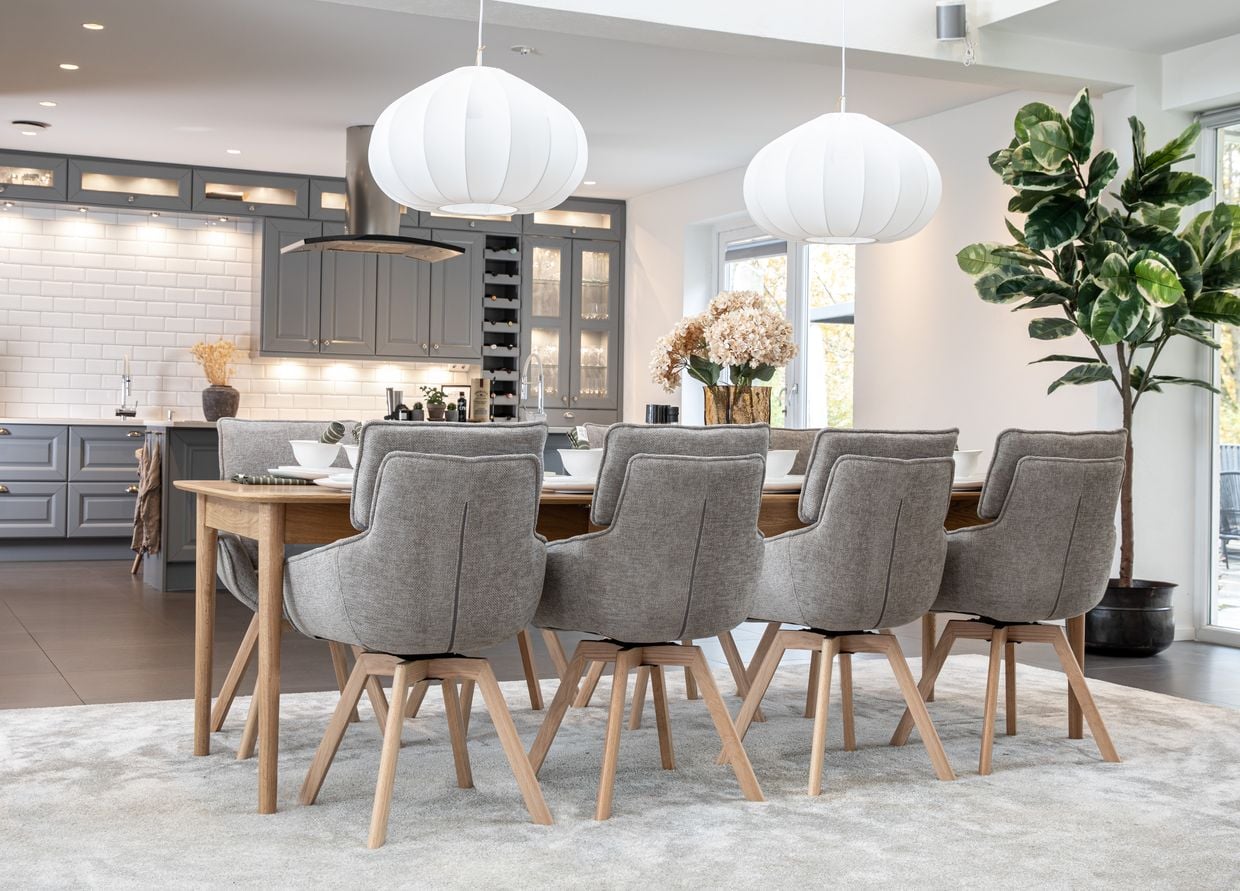 • Snurrbar benställning, sits med kupad form – modern twist som lyfter komforten vid bordet.