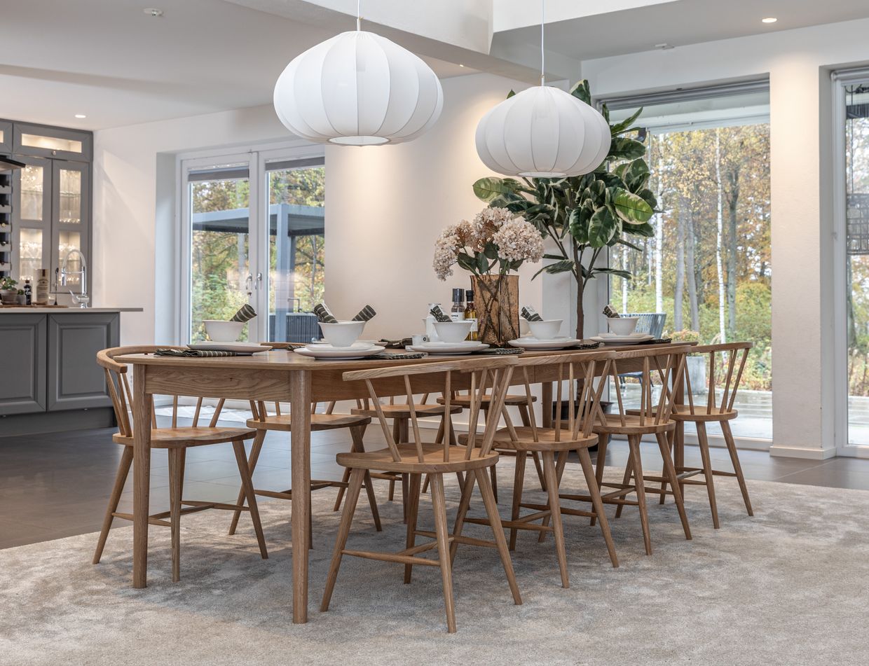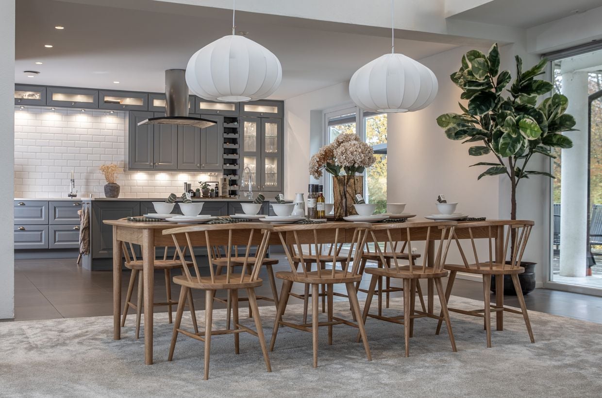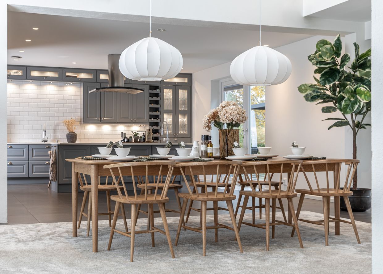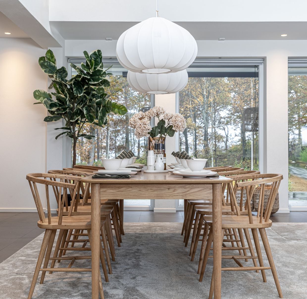 Skapa en klassisk och inbjudande matsalsmiljö med Oskar matbord och Björke stolar i ek. Kombinationen av naturligt trä och tidlös design ger en varm och elegant känsla som passar både vardag och fest.