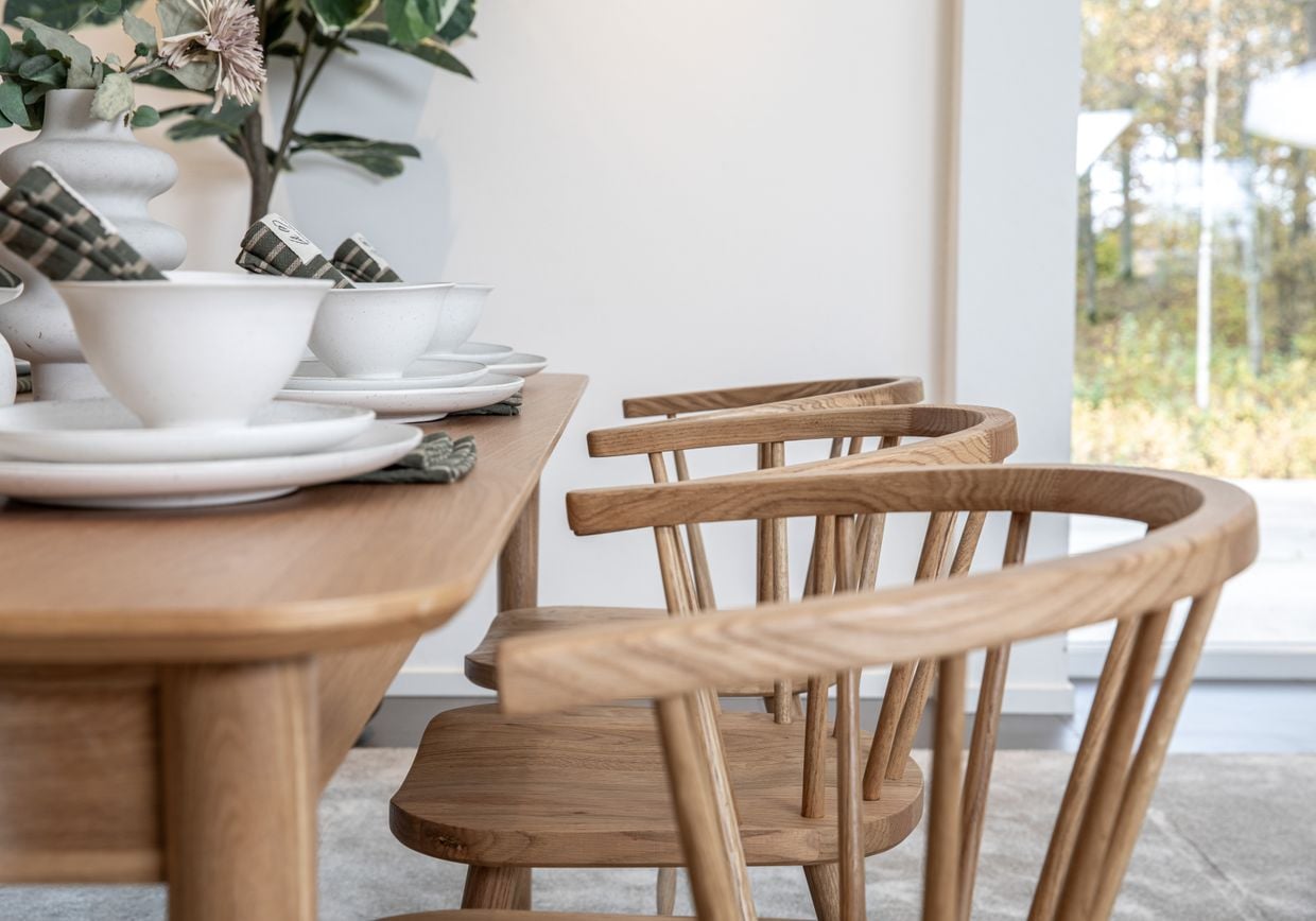 Stol Björke är tillverkad i massiv ek och har en klassisk men robust form. Den bekväma sitsen och det tydliga träutseendet ger en inbjudande känsla – perfekt för både vardagsmiddag och längre matstunder.