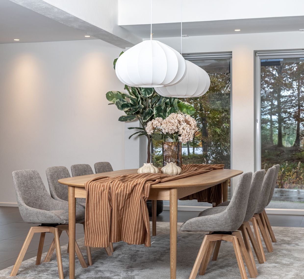 Materialval: Bordsskivan består av 2 mm ekfanér på MDF, med ben och sarg i massiv ek — vilket ger både naturlig karaktär och stilsäker hållbarhet.