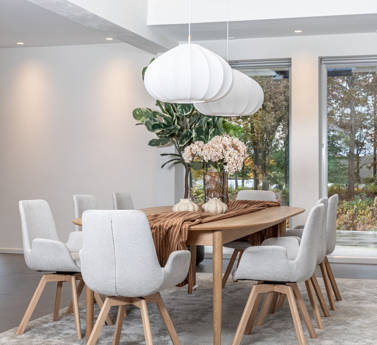 Den ovala formen mjukar upp rummet och skapar flyt, med rundare kanter och öppnare känsla — perfekt för att bjuda in till samtal och gemenskap.