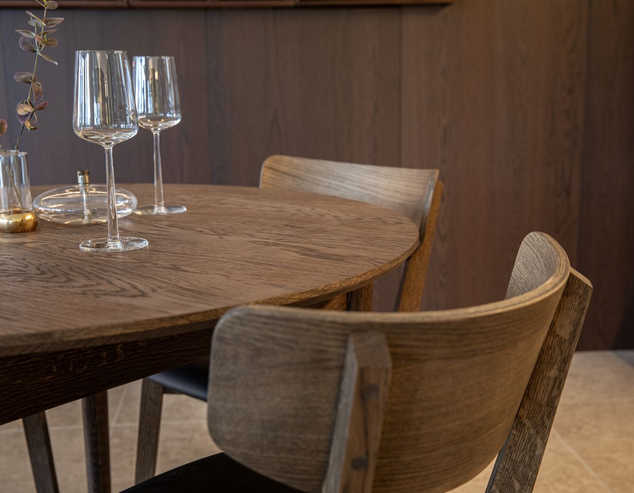 De klassiska Alex-stolarna kompletterar bordet med sitt tidlösa formspråk och gedigna konstruktion. Stolen är tillverkad i massiv ek och har en bekväm, klädd sits som ger god sittkomfort både till vardags och vid längre middagar. Alex är en mångsidig stol som passar lika bra i moderna som mer traditionella miljöer och skapar ett harmoniskt helhetsintryck runt det runda bordet.