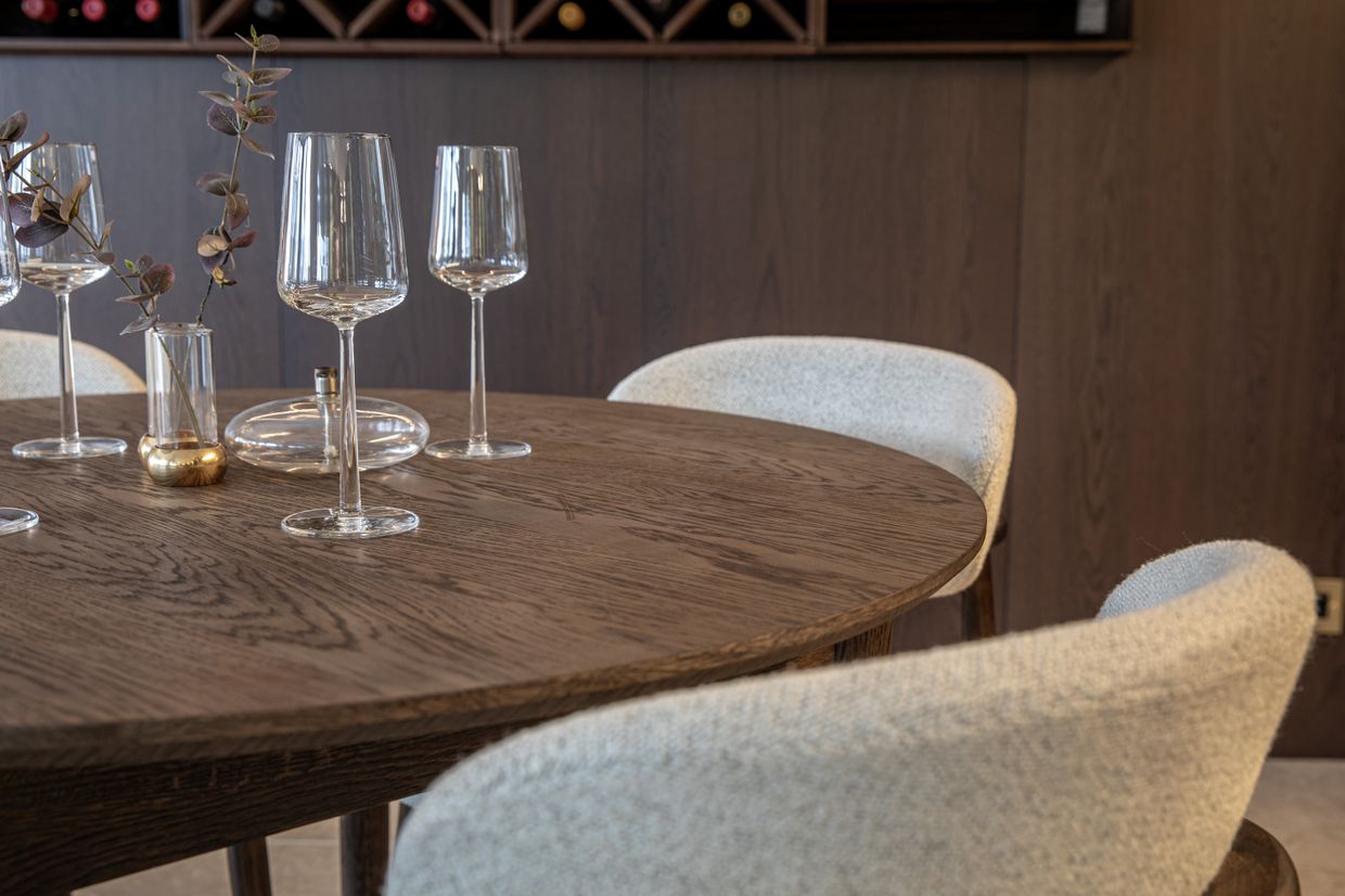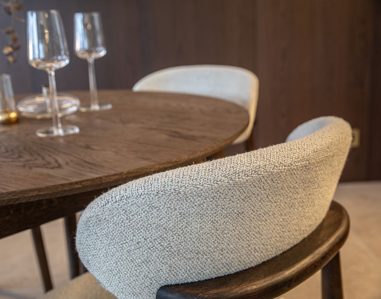 De eleganta Le Chic-stolarna kompletterar bordet med sitt sofistikerade formspråk och höga sittkomfort. Med klädd sits och rygg erbjuder Le Chic en mjuk och inbjudande känsla som gör stolen perfekt för längre middagar. Designen är modern men tidlös och tillför en tydlig premiumkänsla till matgruppen.