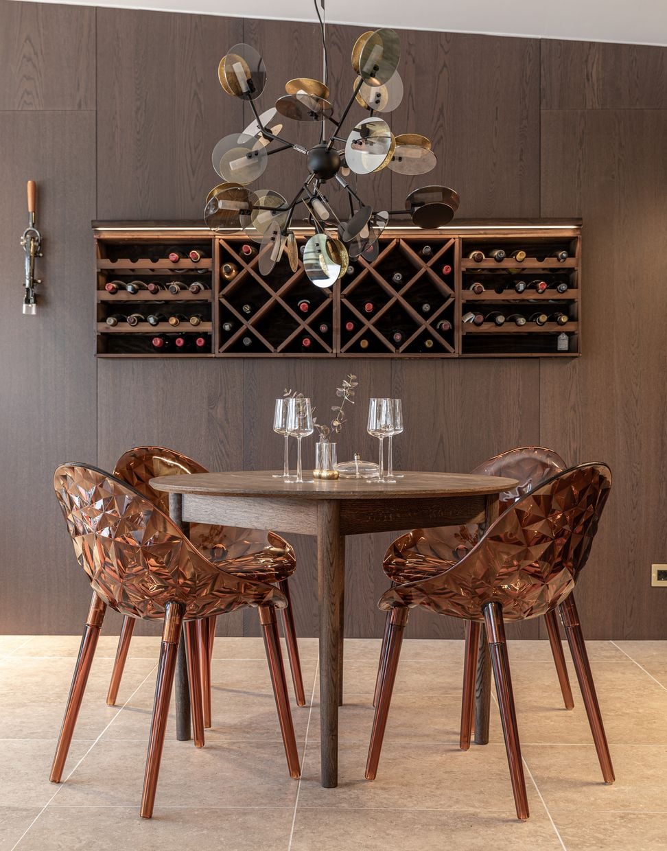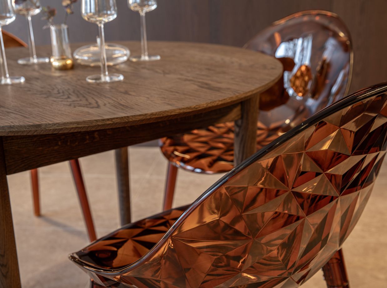 De moderna Plexus-stolarna kompletterar bordet med sitt karaktäristiska och samtida formspråk. Stolarna erbjuder god sittkomfort och ett luftigt visuellt uttryck som skapar en fin balans mot bordets gedigna materialval. Plexus tillför en modern touch och bidrar till ett elegant och välbalanserat helhetsintryck runt bordet.