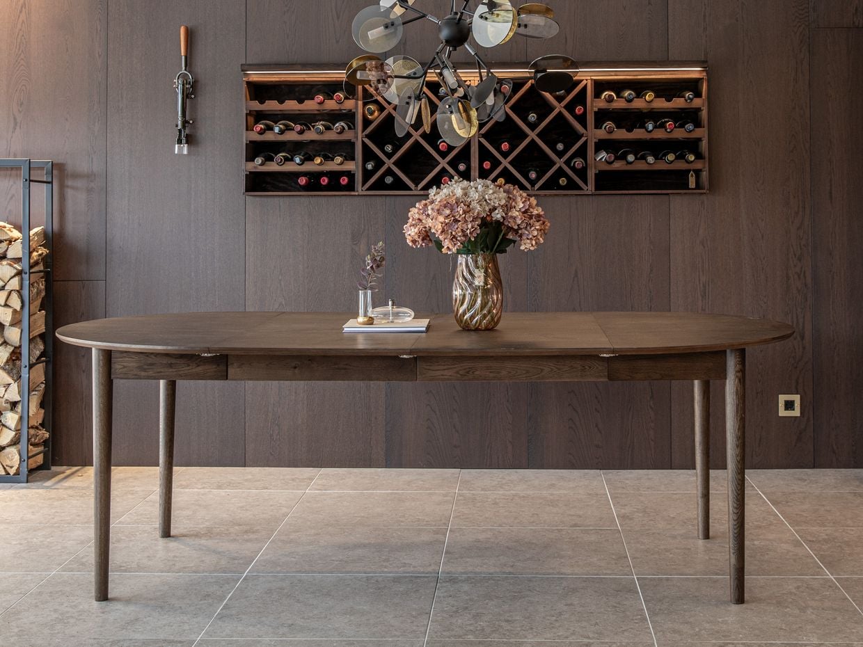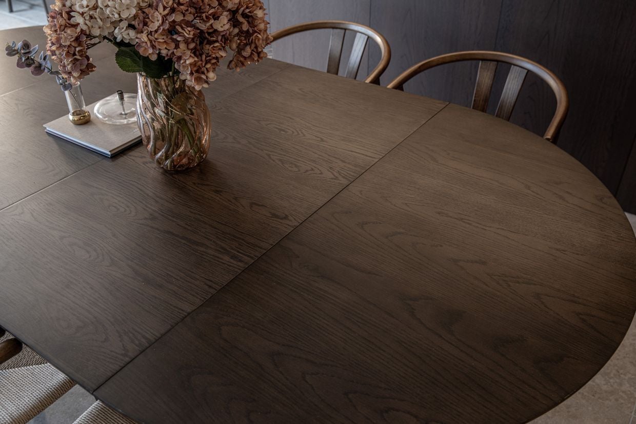 Det runda Oskar matbordet har en diameter på 120 cm i grundutförande och kan enkelt förlängas till 175 cm eller hela 230 cm med hjälp av två iläggsskivor. Bordet passar lika bra för vardagens måltider som för större middagar och sociala tillfällen. Bordsskivan är tillverkad i tjock, rökt ekfanér (smoked oak) som framhäver träets naturliga struktur, medan stomme och ben i massiv ek säkerställer stabilitet, kvalitet och lång livslängd. Den runda formen bidrar till en social och inbjudande känsla där alla runt bordet möts naturligt.