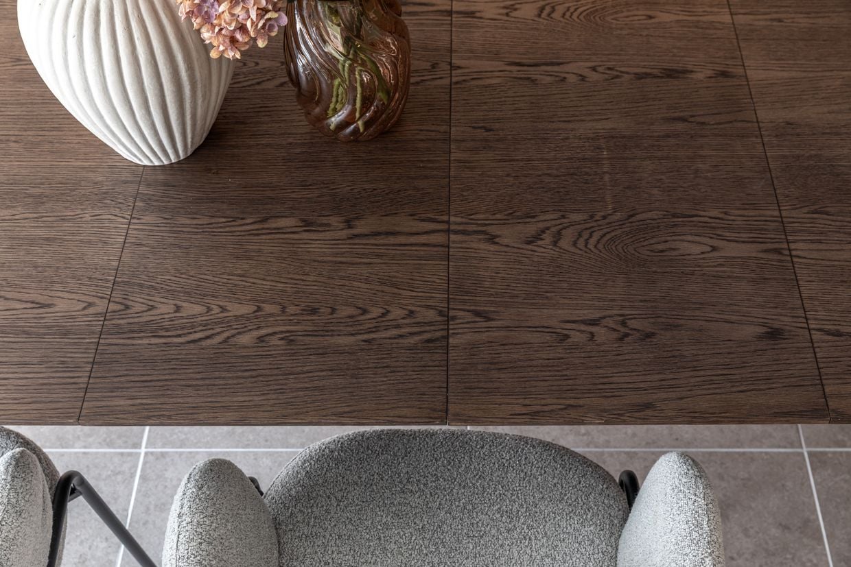 Det förlängningsbara matbordet Oskar är lika praktiskt som stilrent. Bordet är 180 cm i sitt grundutförande och kan enkelt förlängas till 220 eller 260 cm med hjälp av två iläggsskivor. När klaffarna inte används förvaras de smidigt under bordsskivan, vilket ger en diskret och platsbesparande lösning. Bordsskivan är tillverkad i tjock, oljad ekfanér som framhäver träets naturliga ådring, medan stomme och ben i massiv ek står för stabilitet, kvalitet och lång livslängd.