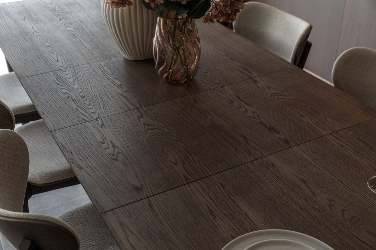 Det förlängningsbara matbordet Oskar är skapat för flexibilitet i vardagen. Bordet är 180 cm i grundutförande och kan enkelt förlängas till 220 eller 260 cm med hjälp av två iläggsskivor. När de inte används förvaras klaffarna smidigt under bordsskivan, vilket ger en praktisk och diskret lösning. Bordsskivan är tillverkad i tjock, oljad ekfanér som framhäver träets naturliga struktur, medan stomme och ben i massiv ek bidrar med stabilitet, kvalitet och lång livslängd.