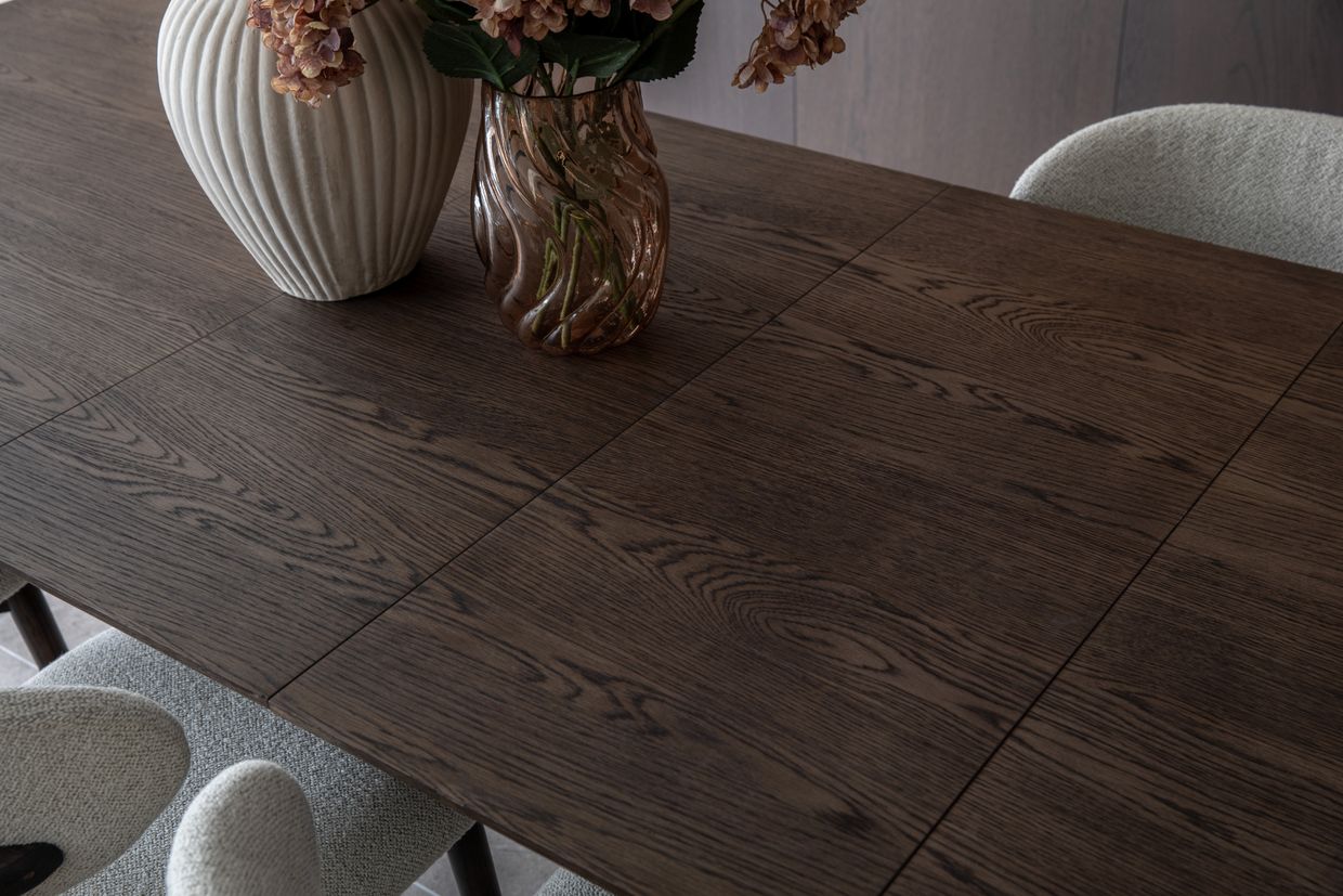 Det förlängningsbara matbordet Oskar är skapat för att anpassas efter livets alla tillfällen. Bordet är 180 cm i sitt grundutförande och kan enkelt förlängas till 220 eller 260 cm med hjälp av två iläggsskivor. När de inte används förvaras klaffarna smidigt under bordsskivan, vilket ger en praktisk och diskret lösning. Bordsskivan är tillverkad i tjock, oljad ekfanér som framhäver träets naturliga ådring, medan stomme och ben i massiv ek står för stabilitet, kvalitet och lång livslängd.