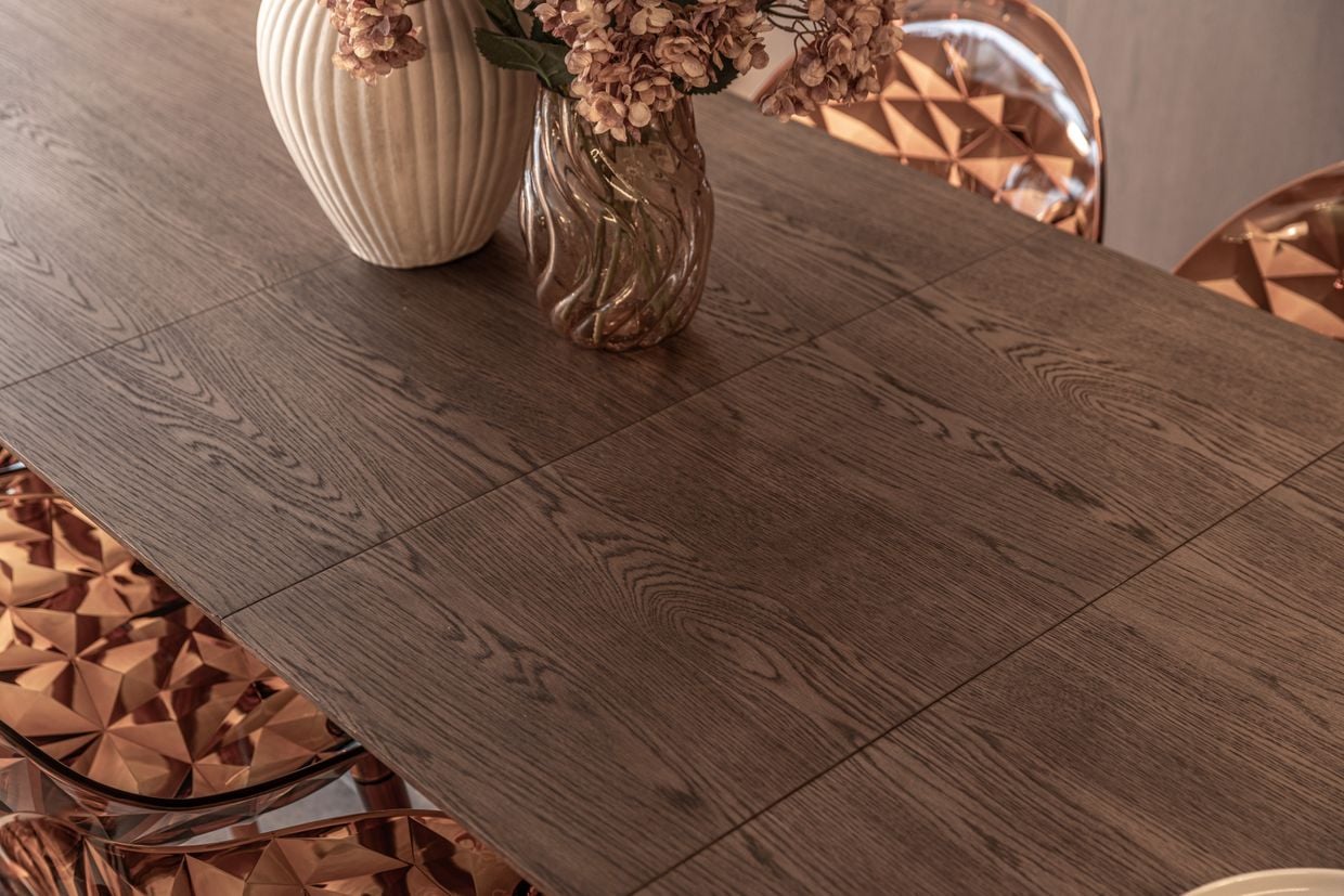 Det förlängningsbara matbordet Oskar erbjuder stor flexibilitet. Bordet är 180 cm i grundutförande och kan enkelt förlängas till 220 eller 260 cm med hjälp av två iläggsskivor. När de inte används förvaras klaffarna smidigt under bordet, vilket ger en diskret och praktisk lösning utan att kompromissa med designen. Bordsskivan är tillverkad i tjock, oljad ekfanér som framhäver träets naturliga ådring, medan stomme och ben i massiv ek ger stabilitet, tyngd och lång livslängd.