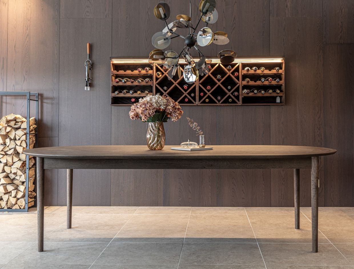 Oskar matbord mäter 260 × 130 cm och ger gott om plats för både familj och gäster. Bordsskivan är tillverkad i MDF och klädd med en tjock, oljad ekfanér som framhäver träets naturliga struktur och ger en slitstark, levande yta. Den stabila stommen i massiv ek bidrar till bordets robusta känsla och gedigna kvalitetskänsla.