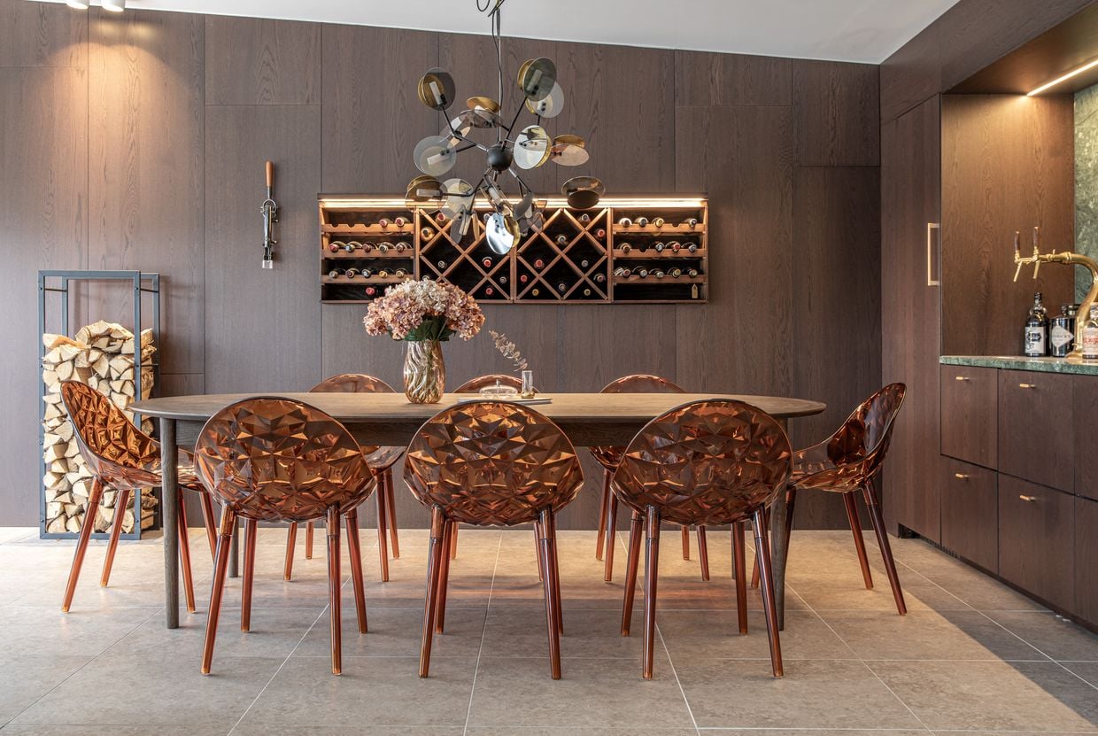 Till bordet ingår 8 st Plexus stolar – en modern designstol med ett grafiskt och skulpturalt uttryck. Stolen är tillverkad i formgjuten polykarbonat och har ett karakteristiskt geometriskt mönster som ger ett luftigt och modernt intryck. Den ergonomiskt formade sitsen ger god komfort trots stolens nätta design, och materialet är slitstarkt samt lätt att underhålla, vilket gör Plexus till ett praktiskt val för matplatsen.