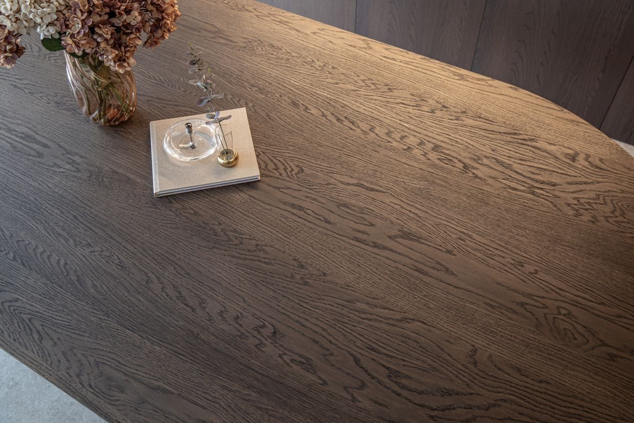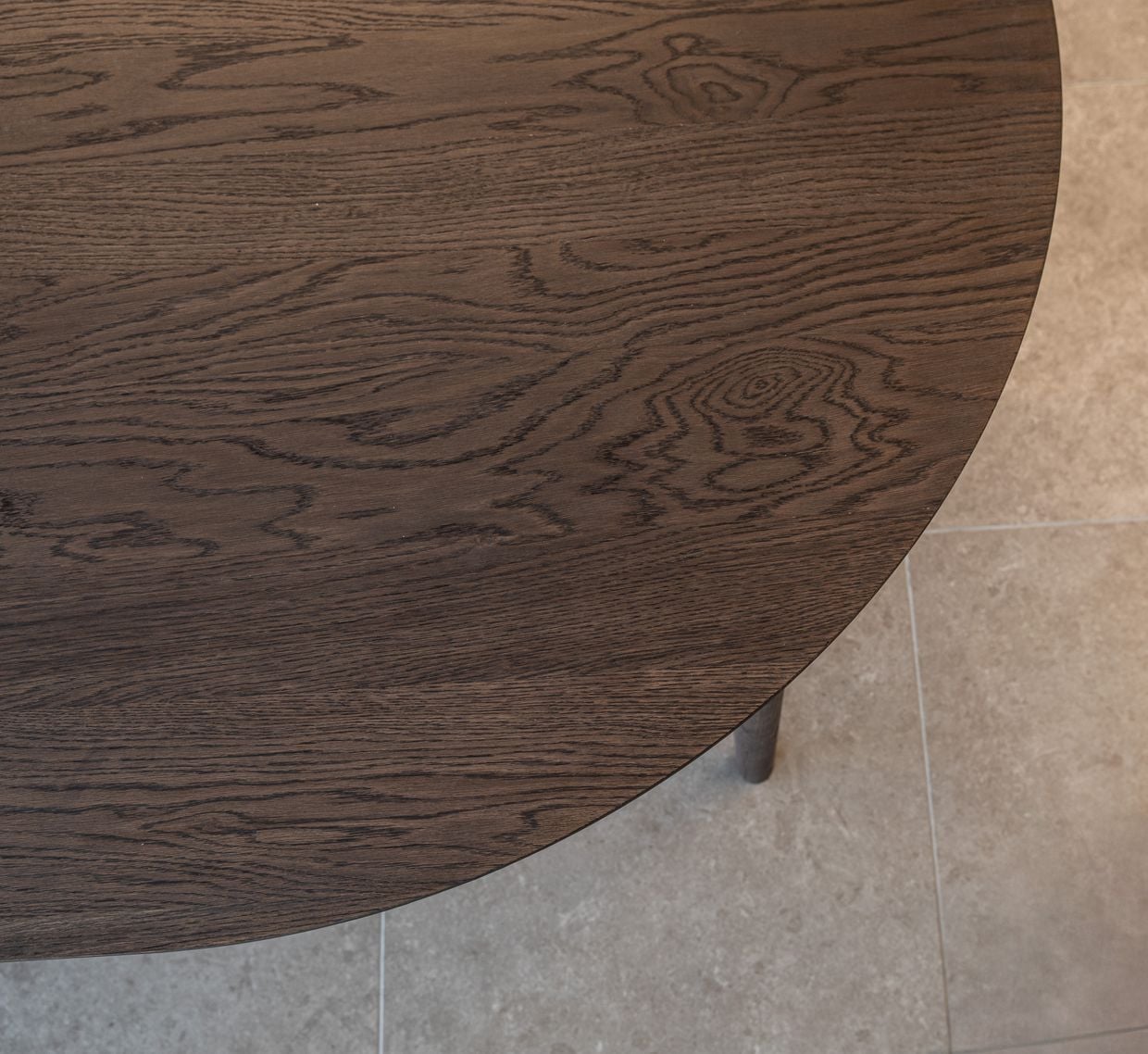 Oskar matbord mäter 260 × 130 cm och ger gott om plats för både familj och gäster. Bordsskivan är tillverkad i MDF och klädd med en tjock, oljad ekfanér som framhäver träets naturliga struktur och ger en slitstark, levande yta. Den stabila stommen i massiv ek bidrar till bordets robusta känsla och gedigna kvalitetskänsla.