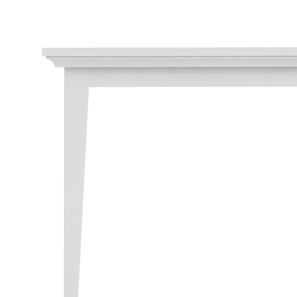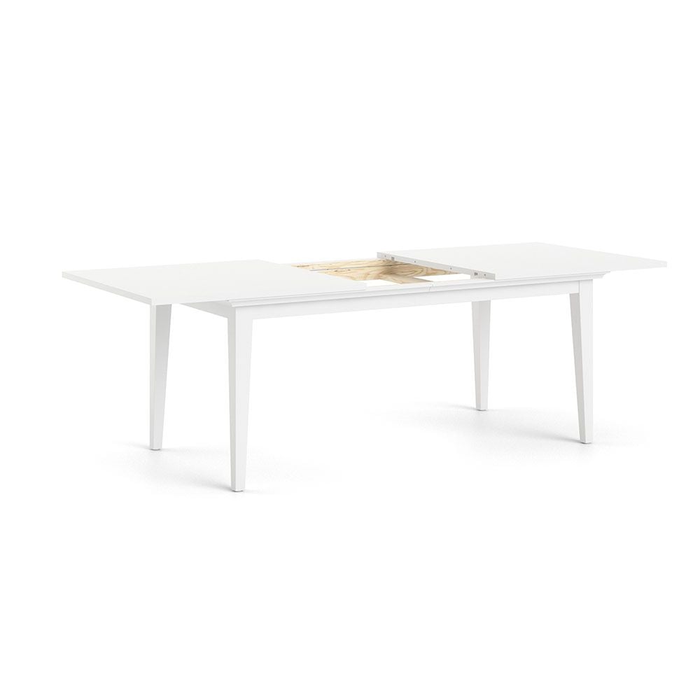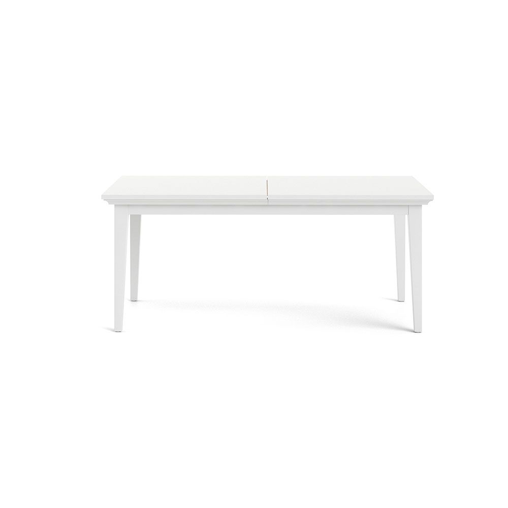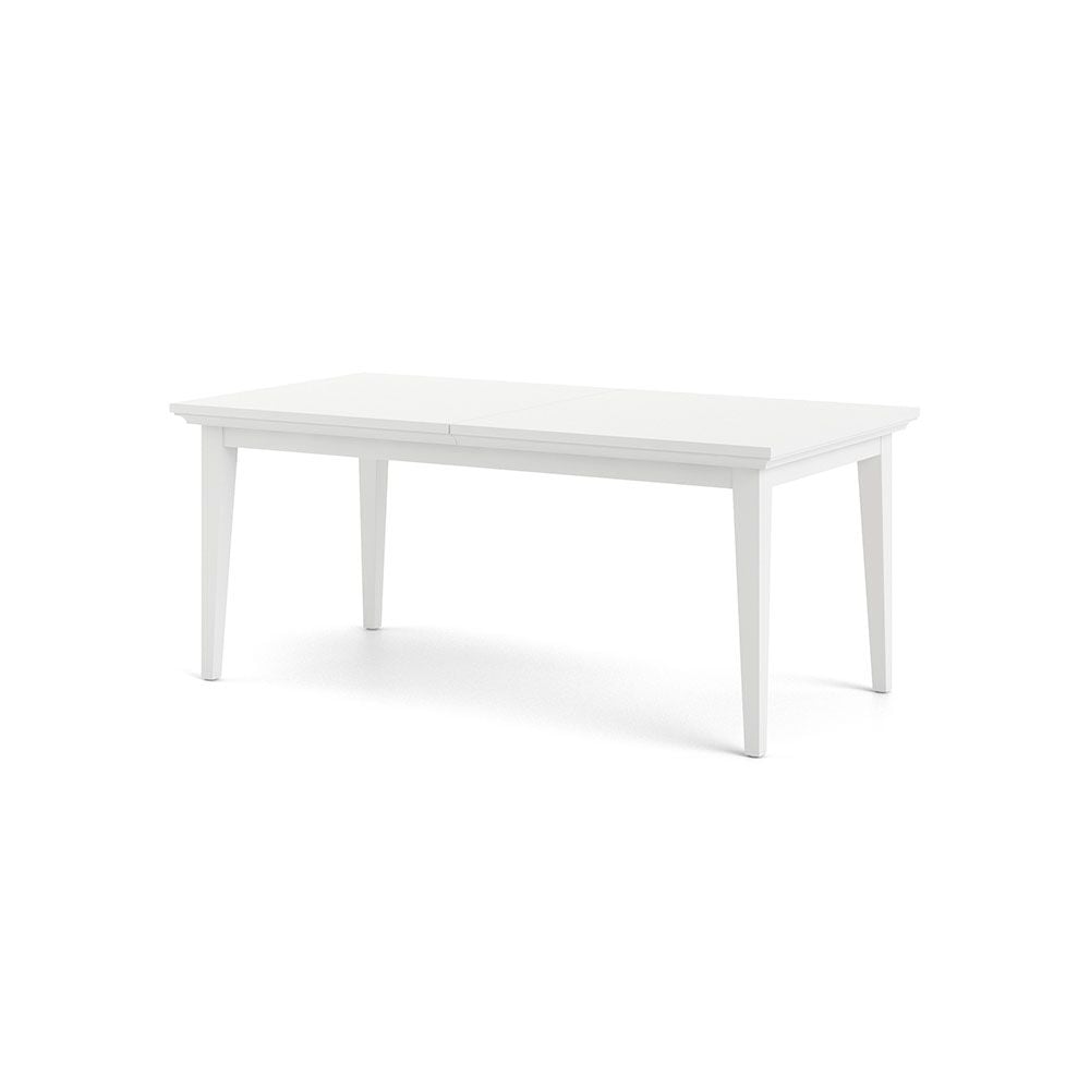 Vitt, klassiskt matbord med ett gömt förvaringsutrymme till iläggsskivor som kan köpas till för att förlänga bordet.