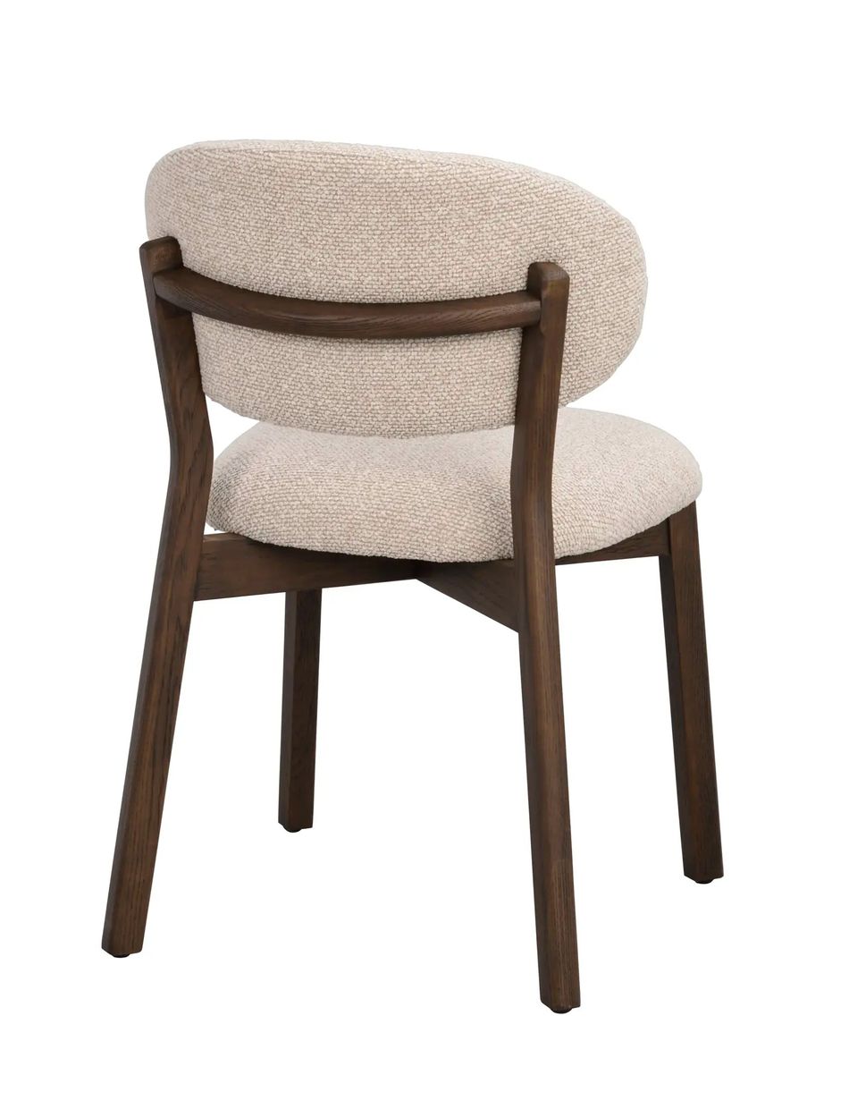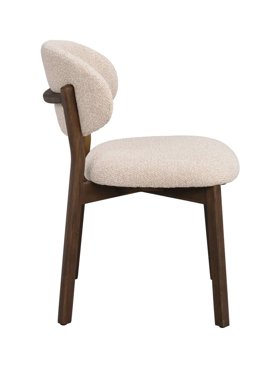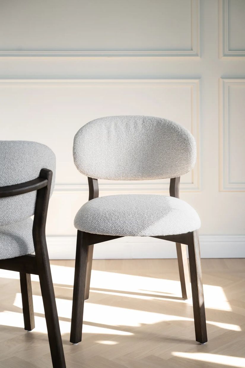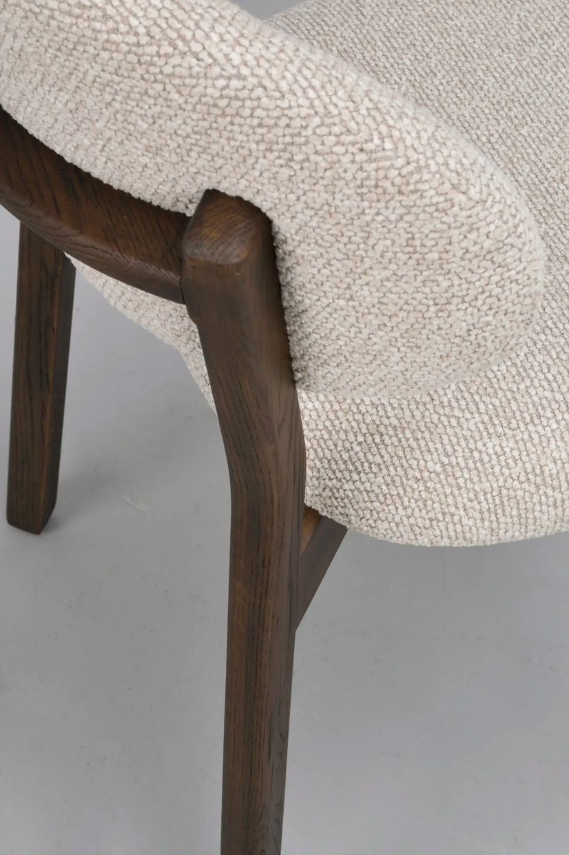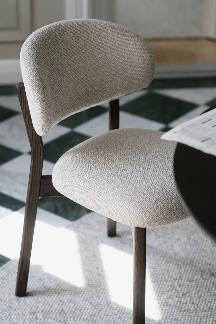 Patterson är en elegant stol i massiv brun ek som kombinerar skandinavisk design med varm komfort. Den kännetecknas av vackra trädetaljer, mjuka övergångar och en balans mellan rundade och raka linjer, vilket gör att den passar till många olika typer av matbord och inredningsstilar. Den tjocka textilklädda ryggbrickan och sitsen ger en generös och bekväm sittupplevelse. Tyget, med något grövre och mer livfull struktur, tillför karaktär och ett modernt uttryck.
