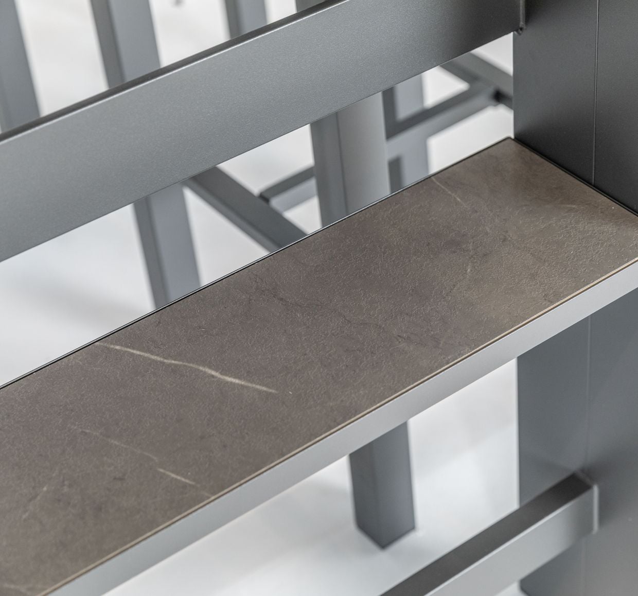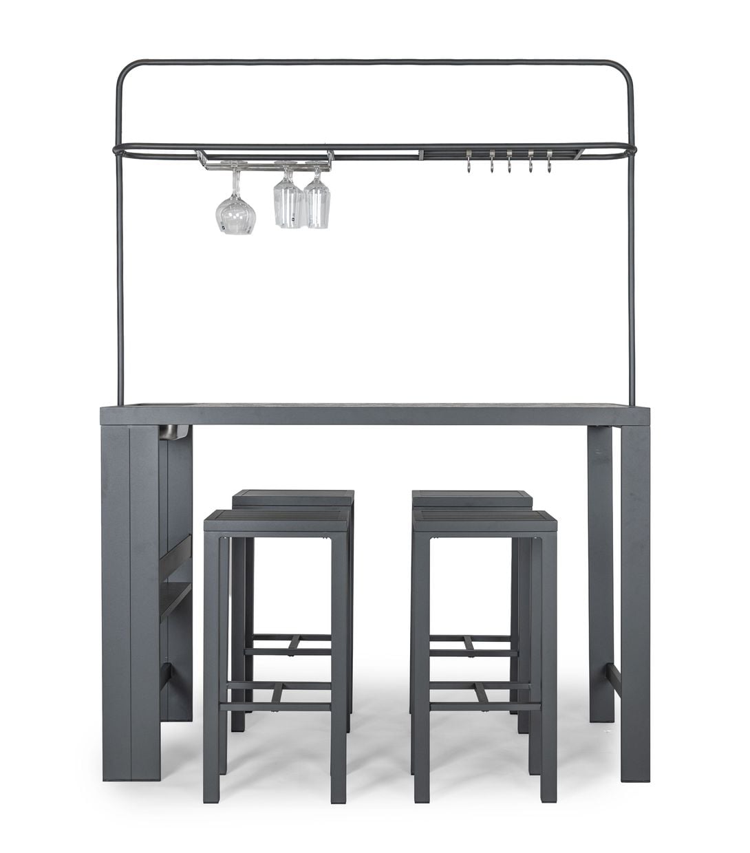Barbordet är tillverkat i aluminium, vilket gör det både lätt och tåligt mot väder och vind. Den smarta konstruktionen erbjuder praktiska detaljer som hyllplan och förvaring, samtidigt som den integrerade ställningen ovanför bordet ger plats för glas och tillbehör – perfekt för sociala stunder utomhus.