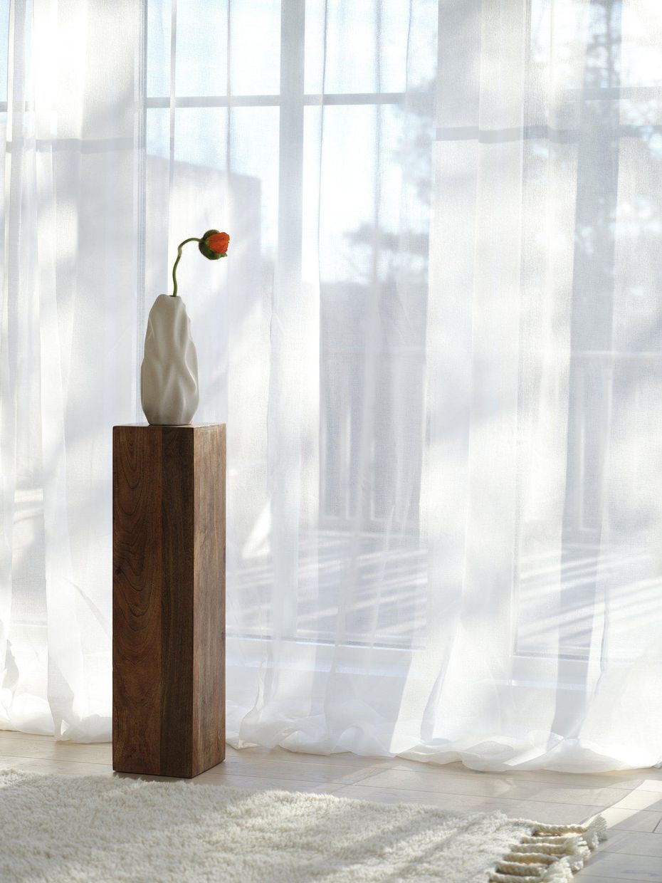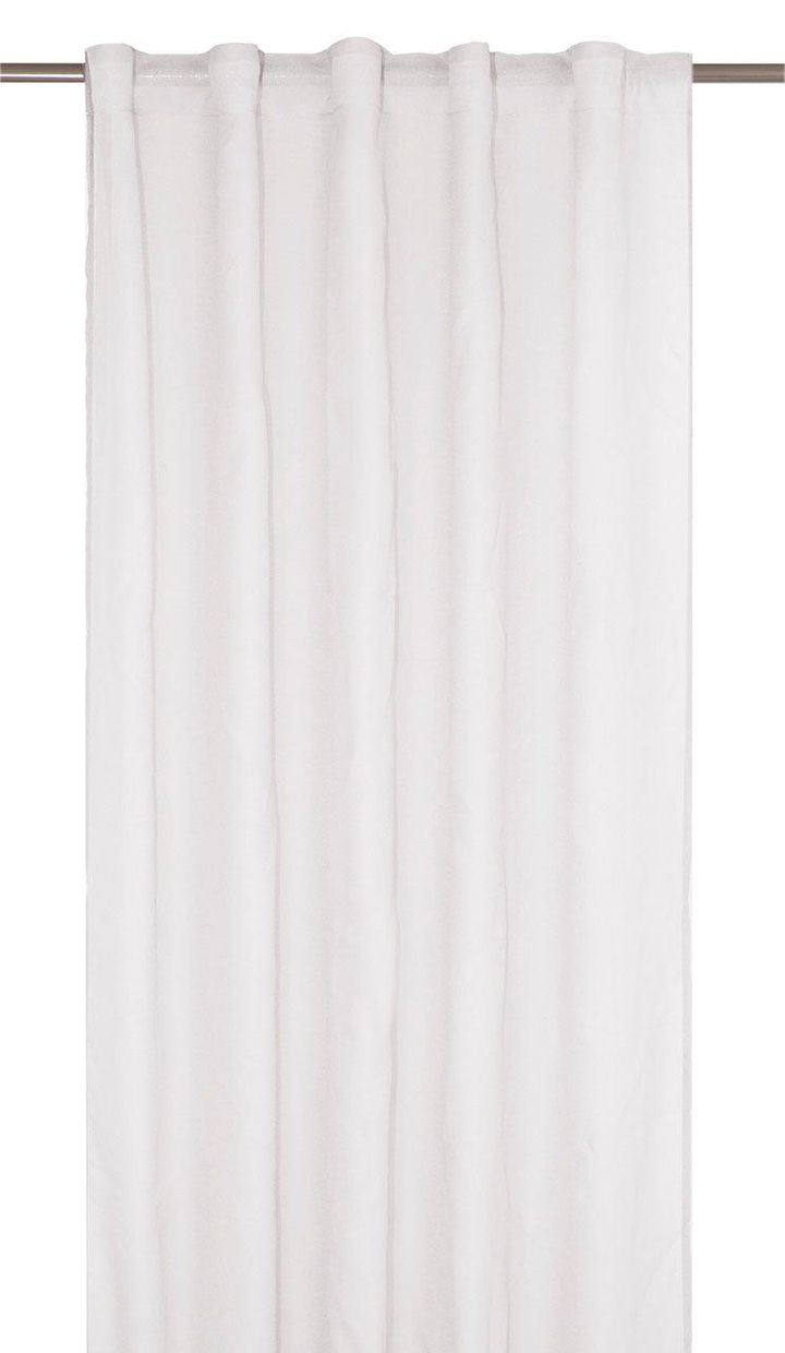 Extra bred multibandslängd i ett skirt tyg som silar ljuset. Tyget har en vacker struktur och färgskiftning som gör det levande. Den dubbla bredden gör att den passar bra i stora fönsterpartier. Har multiband i ovankant, fållade långsidor och overlocksöm i nederkant. Använd snabbfållningsband för att få rätt längd på gardinen. Multibandet är en flexibel lösning som gör att gardinen kan hängas upp antingen med fingerkrokar, räkor eller direkt på en stång beroende på vilken typ av veck och vilket fall man vill ha på gardinen. Mått 280x300cm. Kan krympa max 3%