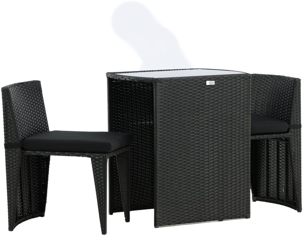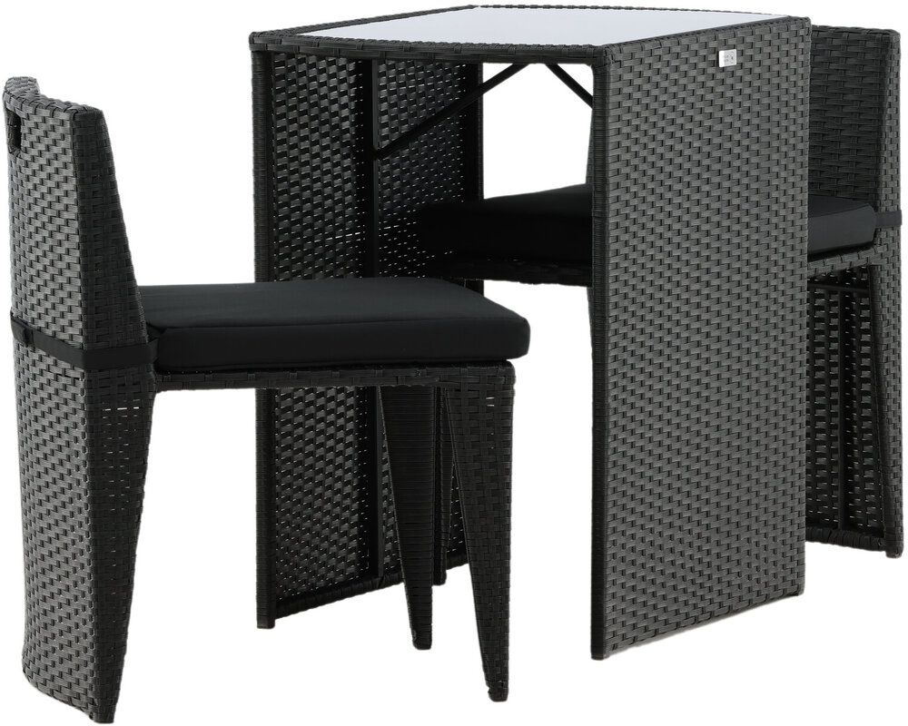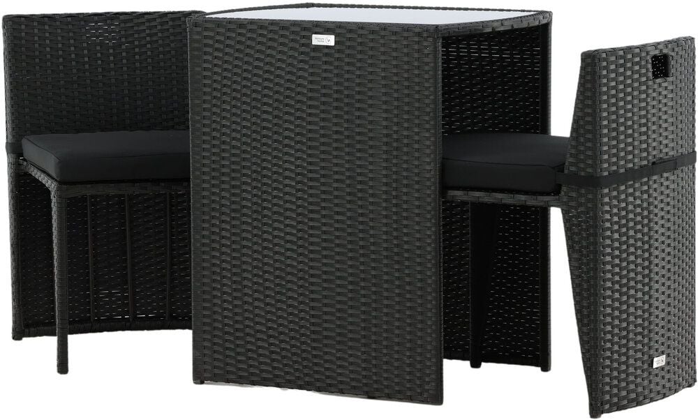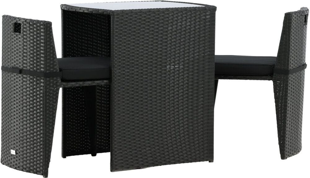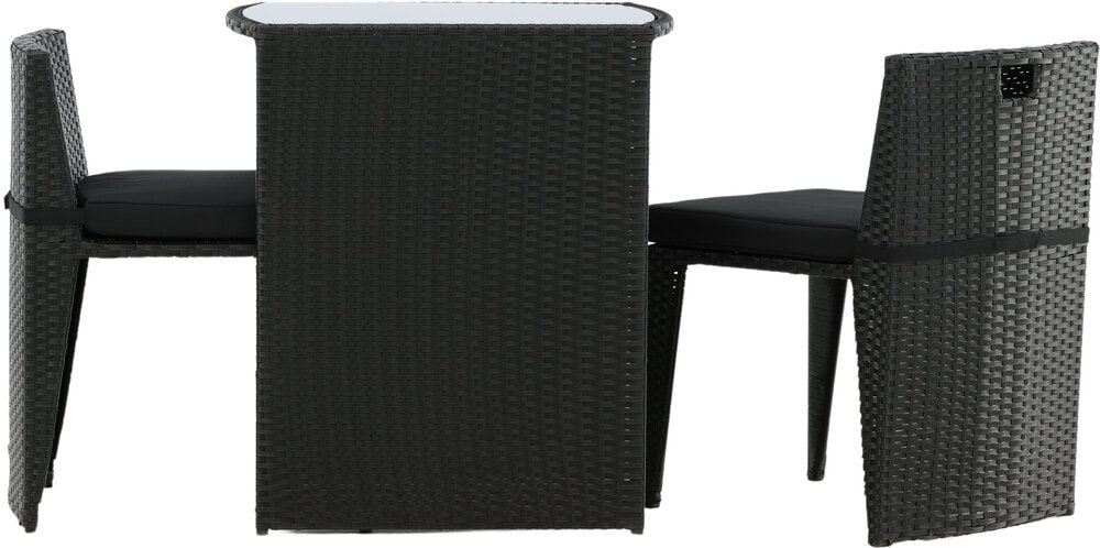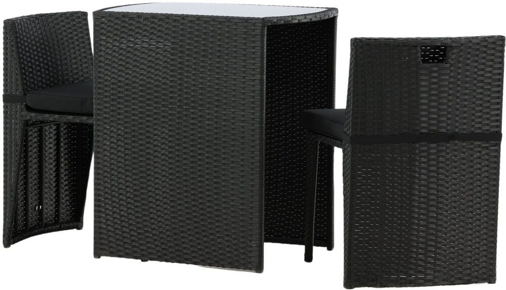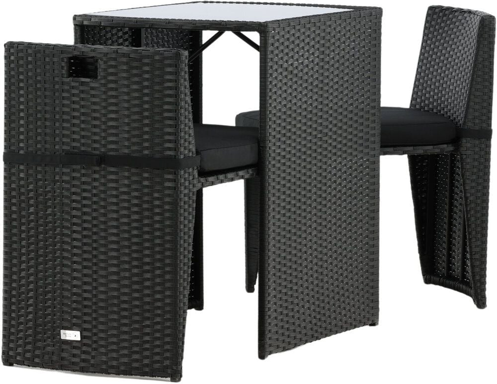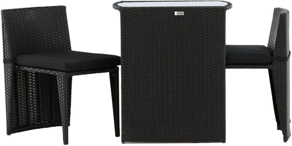 Mysigt svart caféset i en nätt design tillverkat i tåligt konstrotting som passar perfekt till den mindre uteplatsen. Cafésetet består av två stolar och ett bord med tillhörande glasskiva som står pall för både väder och vind, de nätta stolarna kommer med mjuka sittdynor och du kan enkelt skjuta in stolarna under bordet för enkel förvaring och platsbesparing.