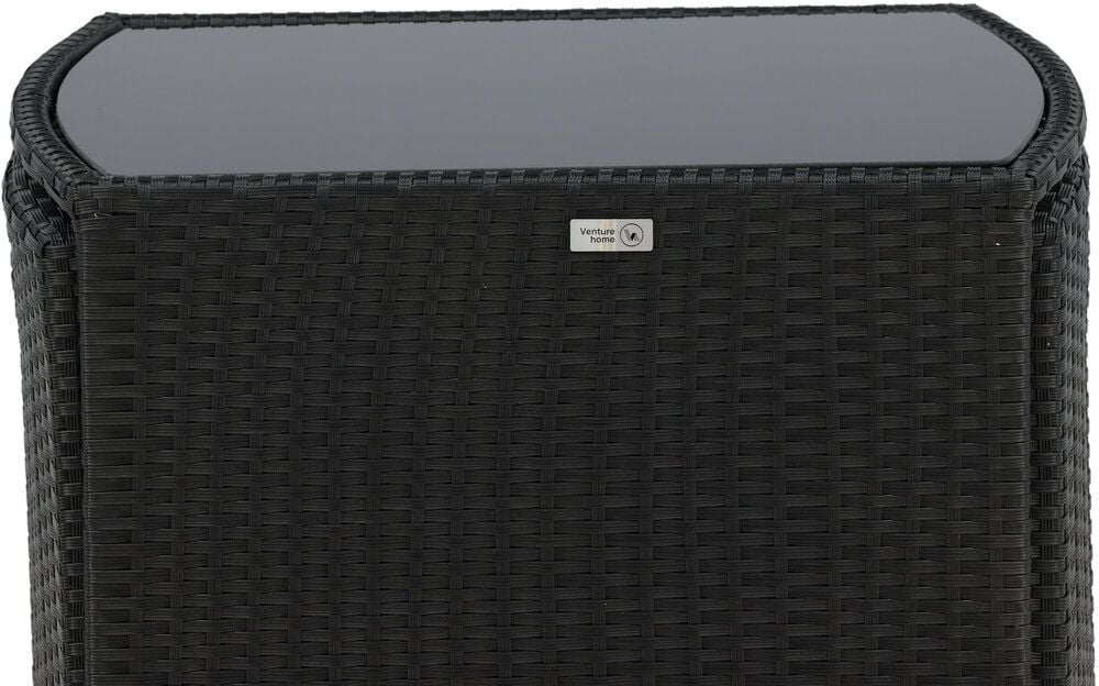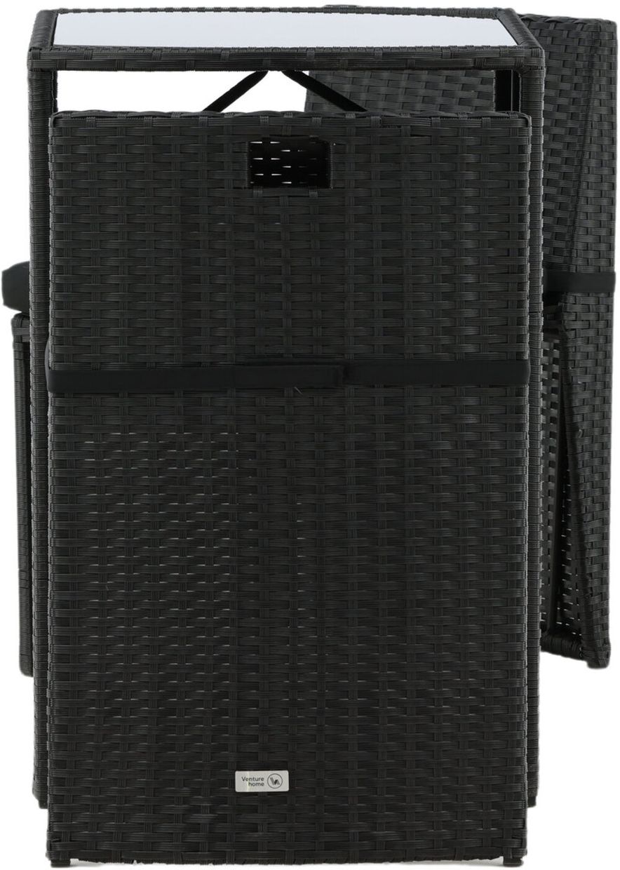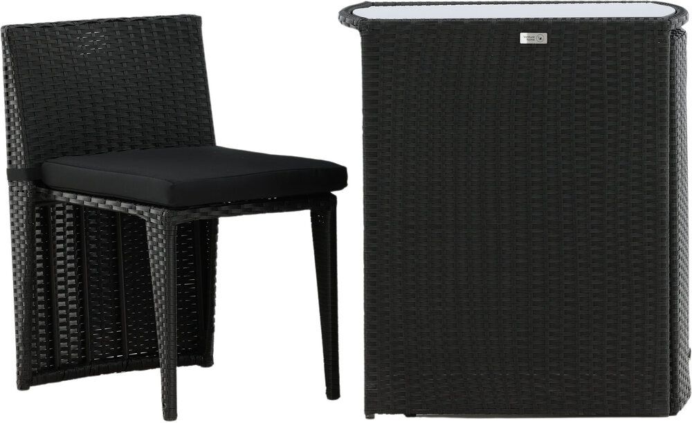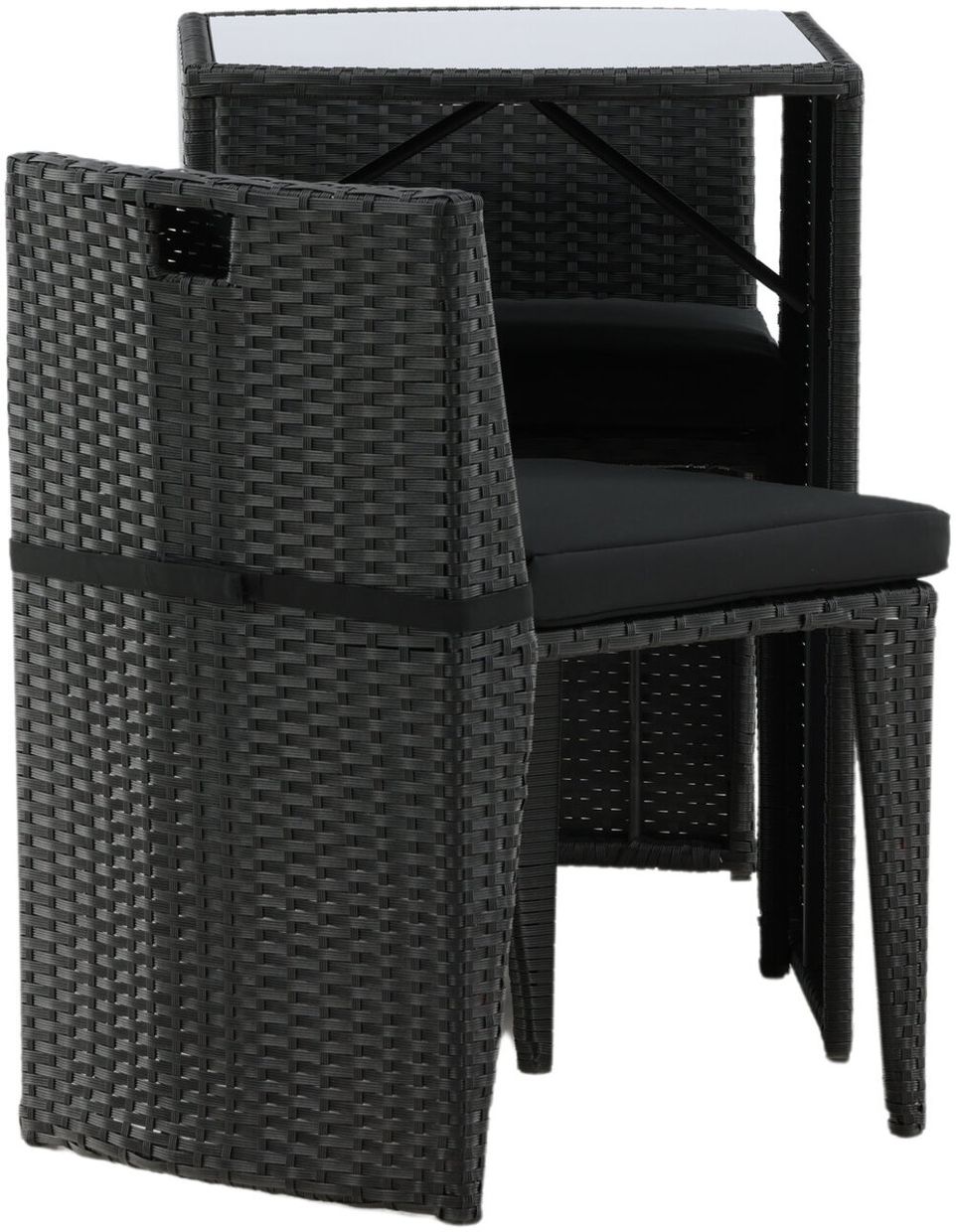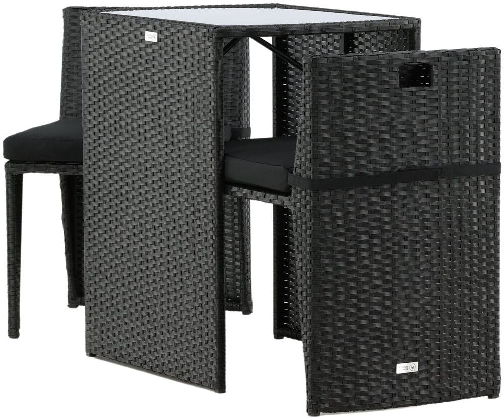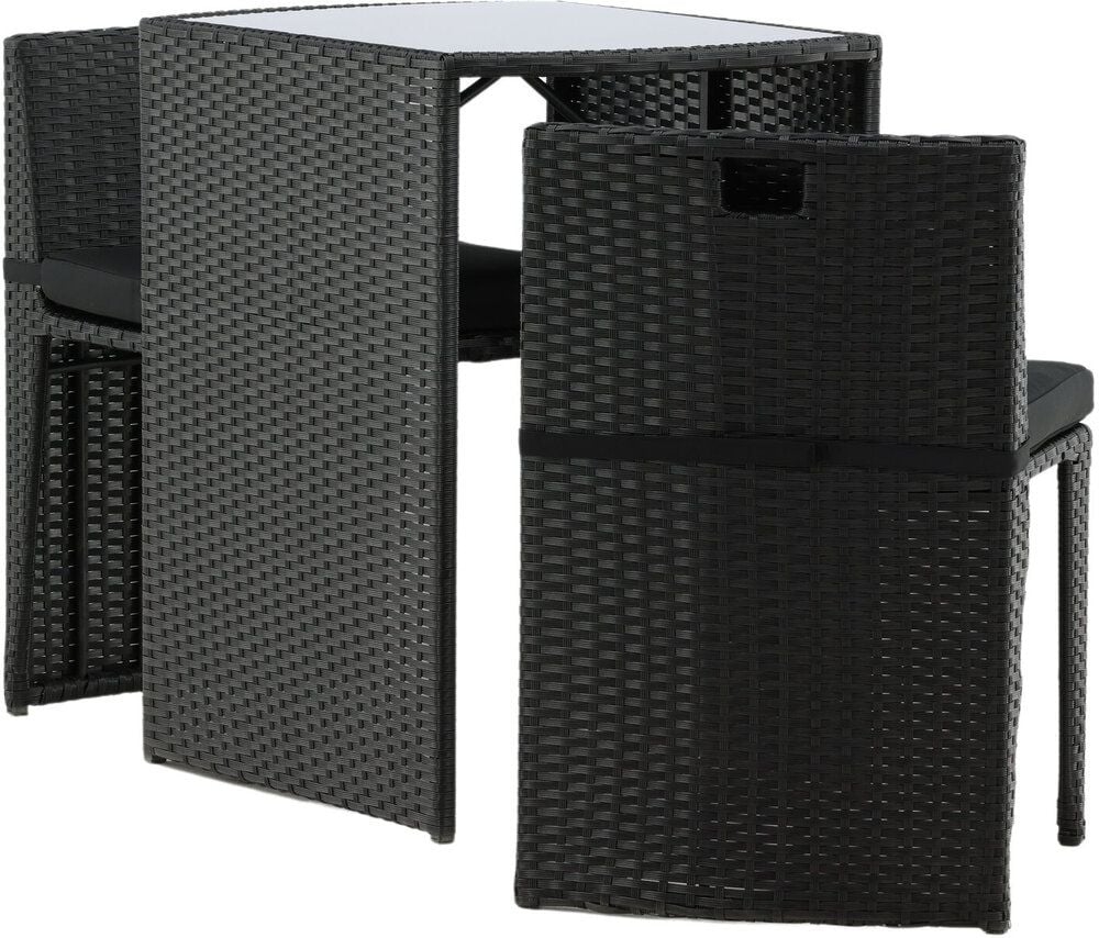 Mysigt svart caféset i en nätt design tillverkat i tåligt konstrotting som passar perfekt till den mindre uteplatsen. Cafésetet består av två stolar och ett bord med tillhörande glasskiva som står pall för både väder och vind, de nätta stolarna kommer med mjuka sittdynor och du kan enkelt skjuta in stolarna under bordet för enkel förvaring och platsbesparing.