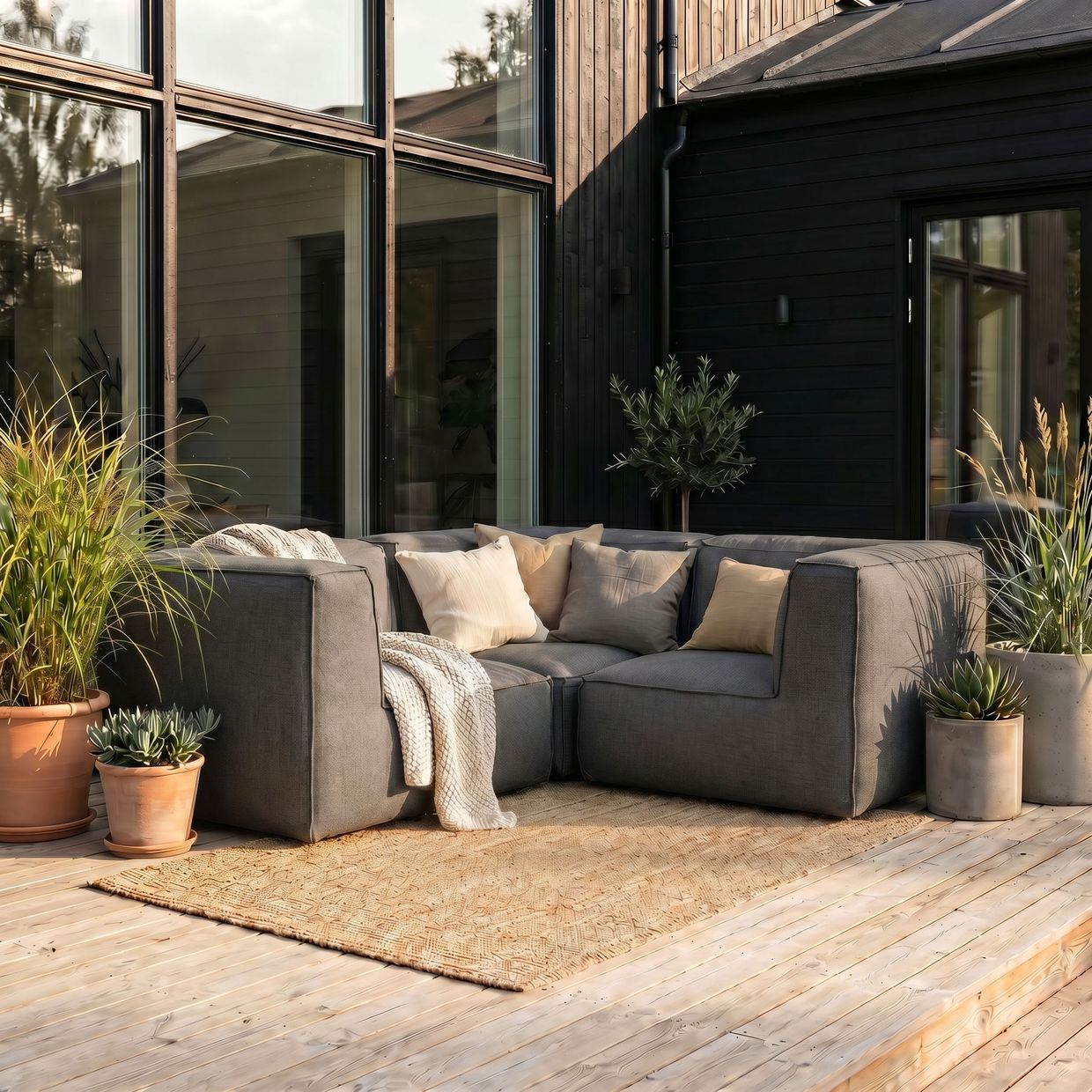 Soffan byggs upp av olika moduler såsom hörndelar, 1-sitsar och divaner från Skärgård-serien. Det gör att du kan förändra, bygga ut eller anpassa din soffgrupp över tid – perfekt för både små och stora uteplatser.