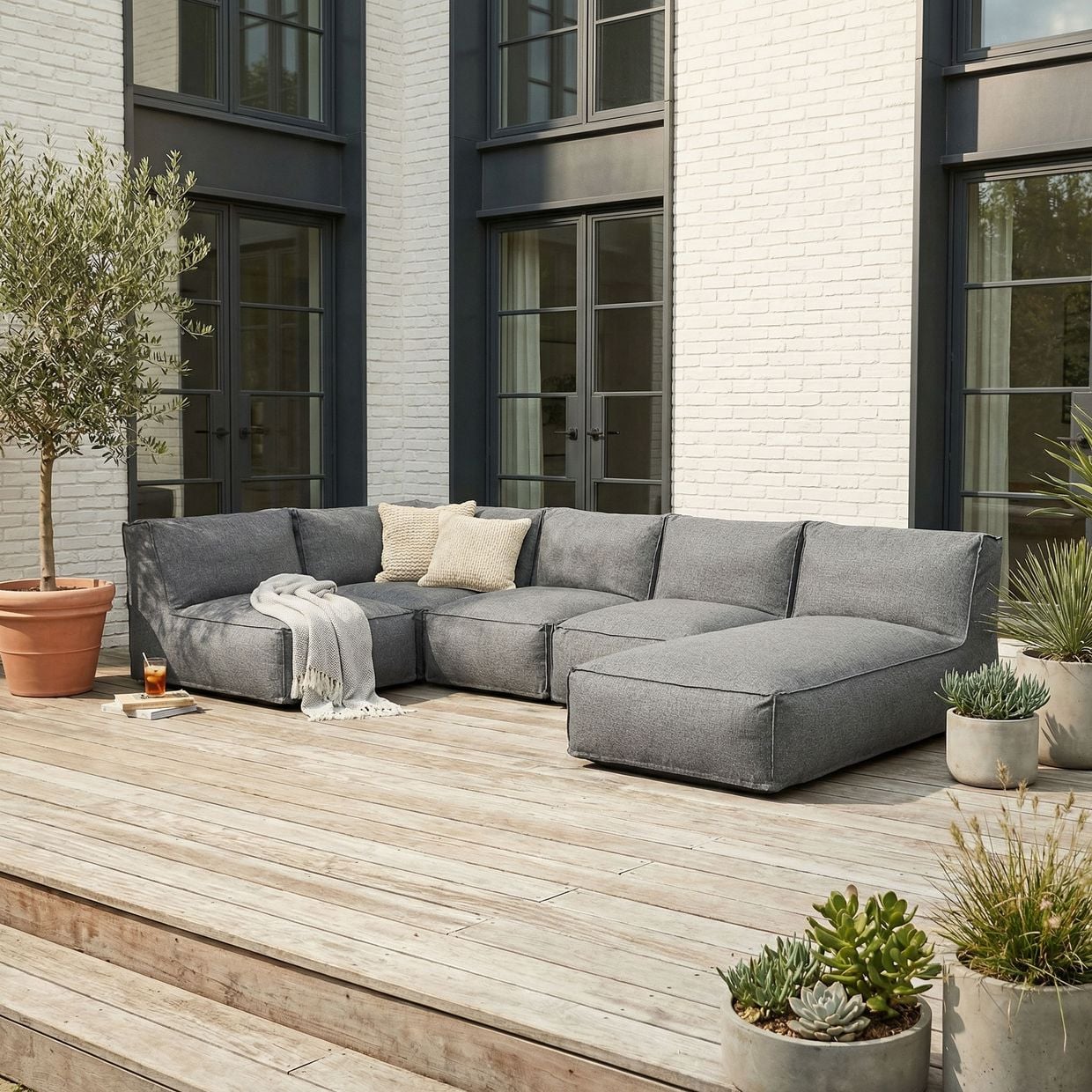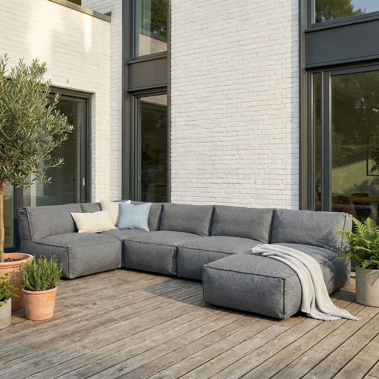 Soffan byggs upp av olika moduler såsom hörndelar, 1-sitsar och divaner från Skärgård-serien. Det gör att du kan förändra, bygga ut eller anpassa din soffgrupp över tid – perfekt för både små och stora uteplatser.