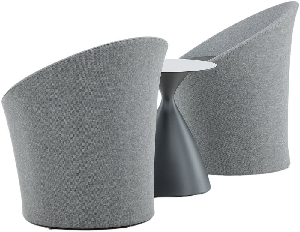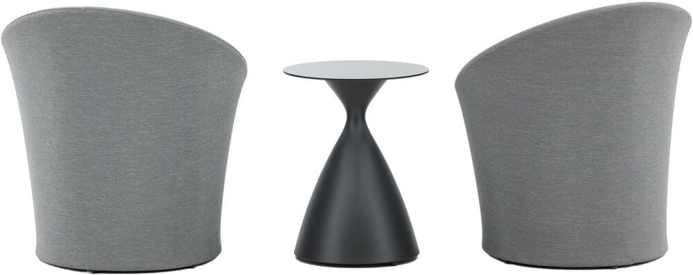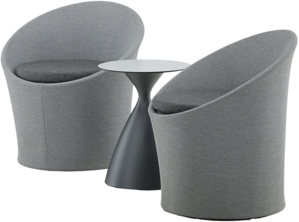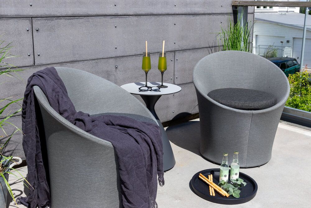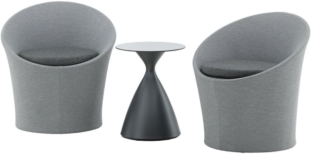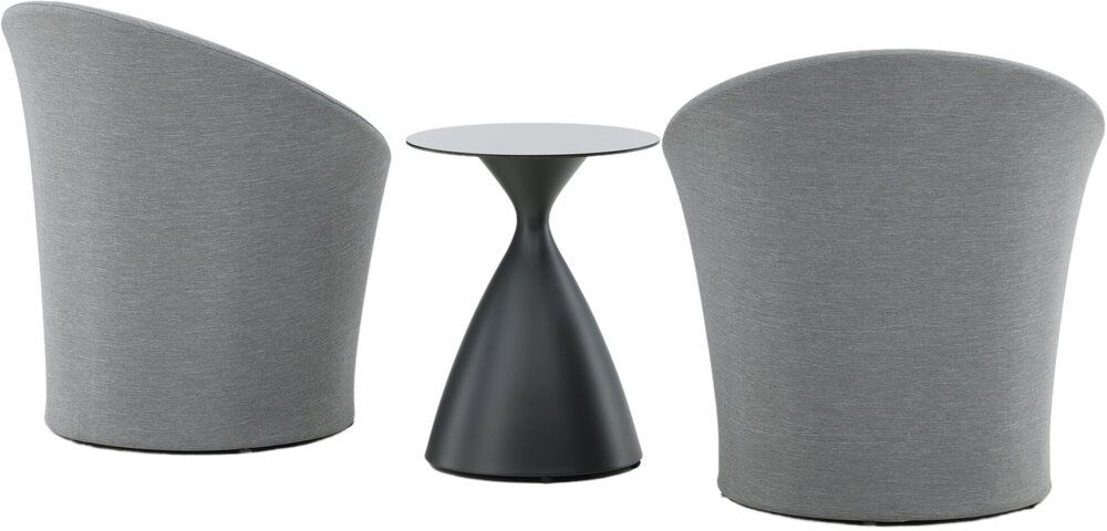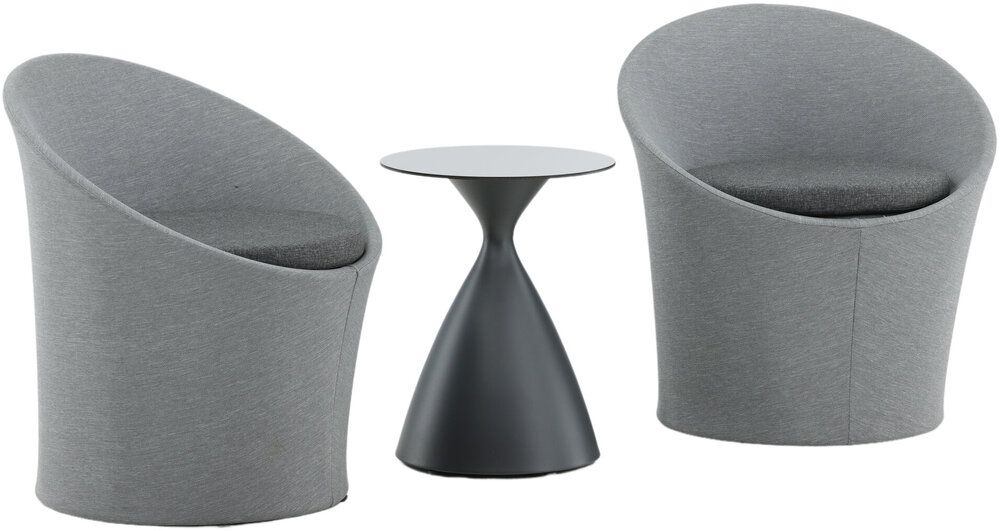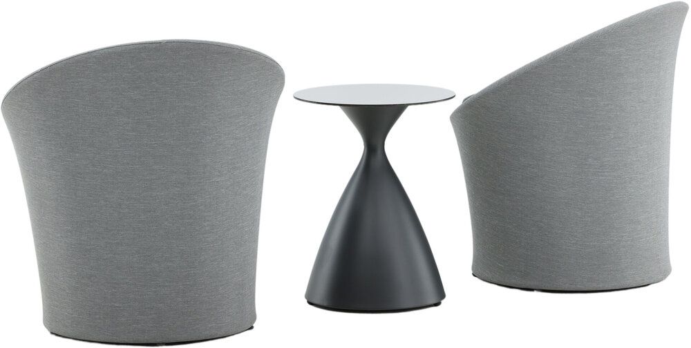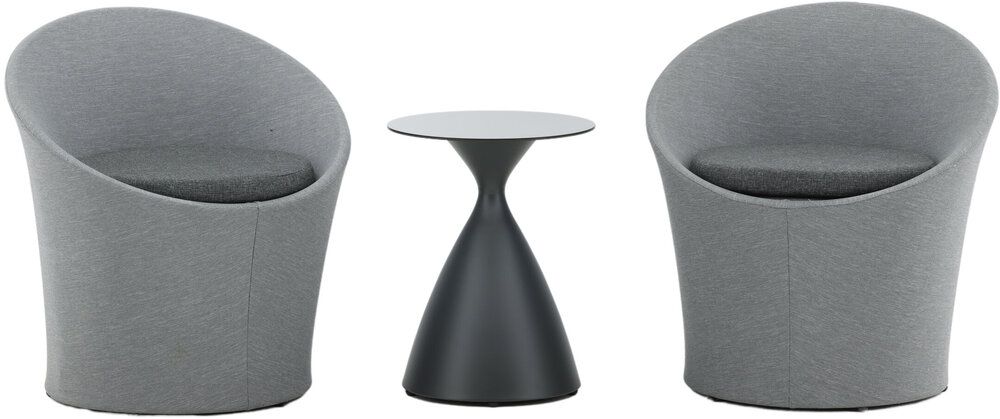 Sätt en personlig prägel på möbleringen i sommar med ett mysigt loungeset från serien Spoga i modern design. De runda formerna skapar en inbjudande och bekväm look, stolarna har en läcker grå kulör, tillverkade av tyg, och det matchande nätta bordet är i svart aluminium. Njut av trevliga fikastunder på uteplatsen!