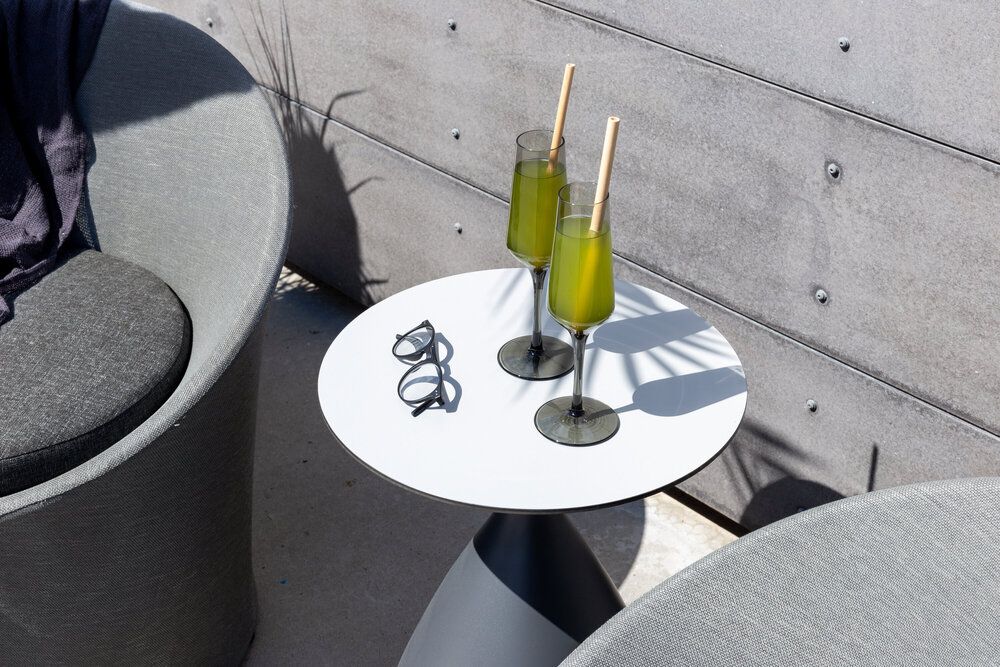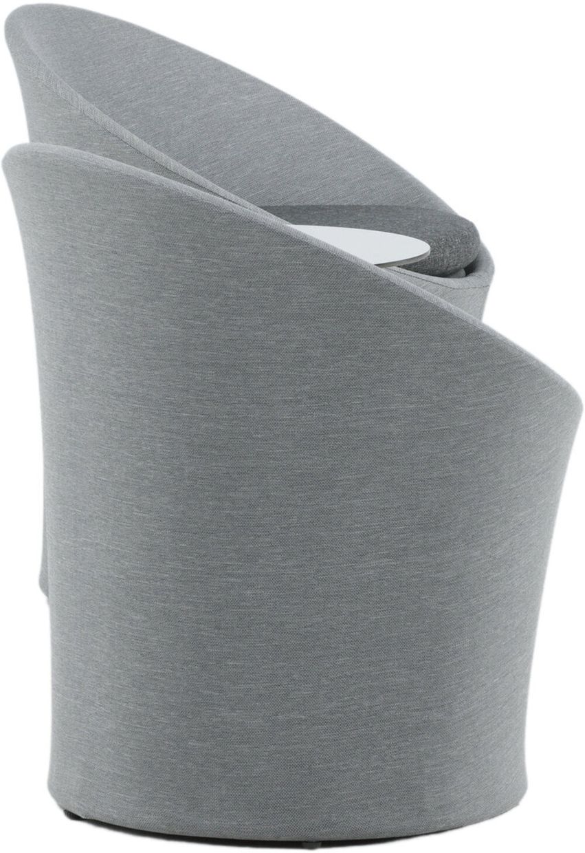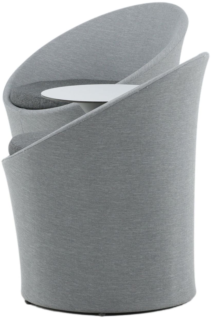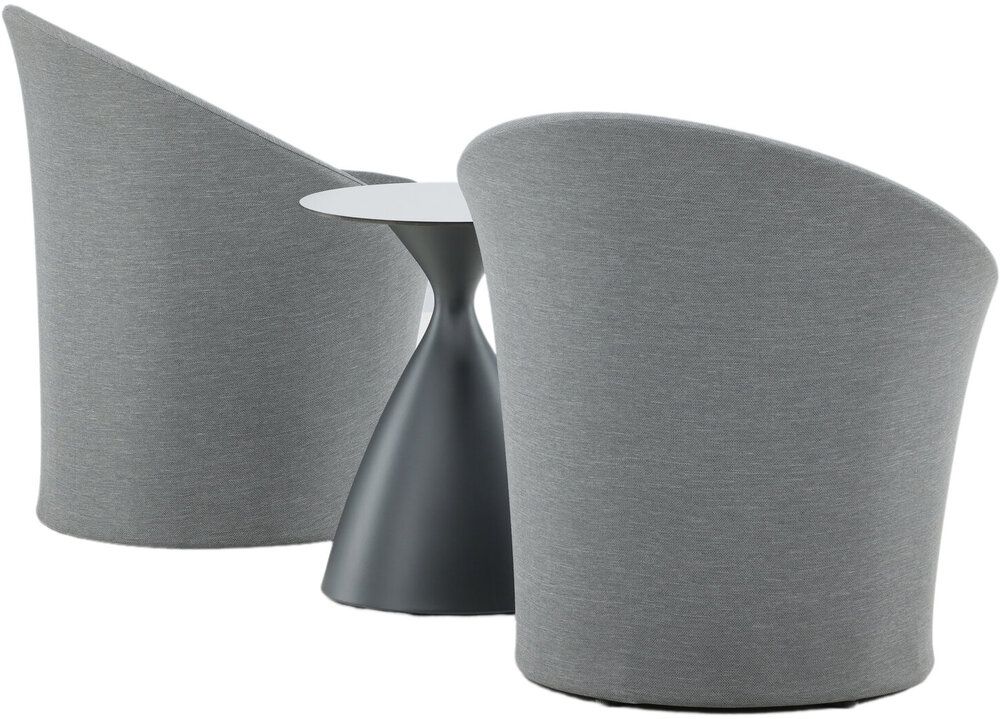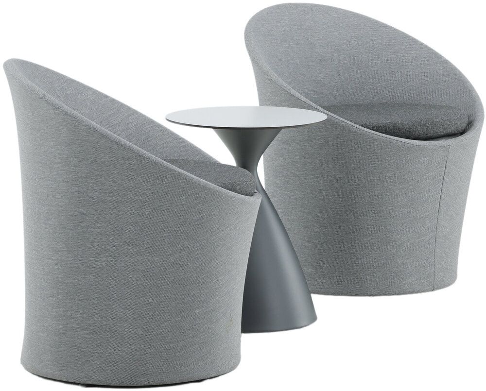 Sätt en personlig prägel på möbleringen i sommar med ett mysigt loungeset från serien Spoga i modern design. De runda formerna skapar en inbjudande och bekväm look, stolarna har en läcker grå kulör, tillverkade av tyg, och det matchande nätta bordet är i svart aluminium. Njut av trevliga fikastunder på uteplatsen!