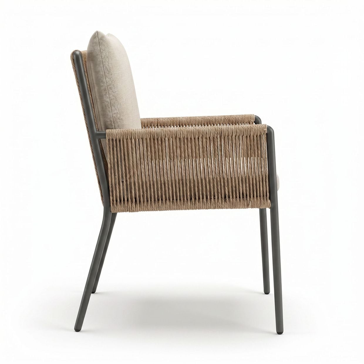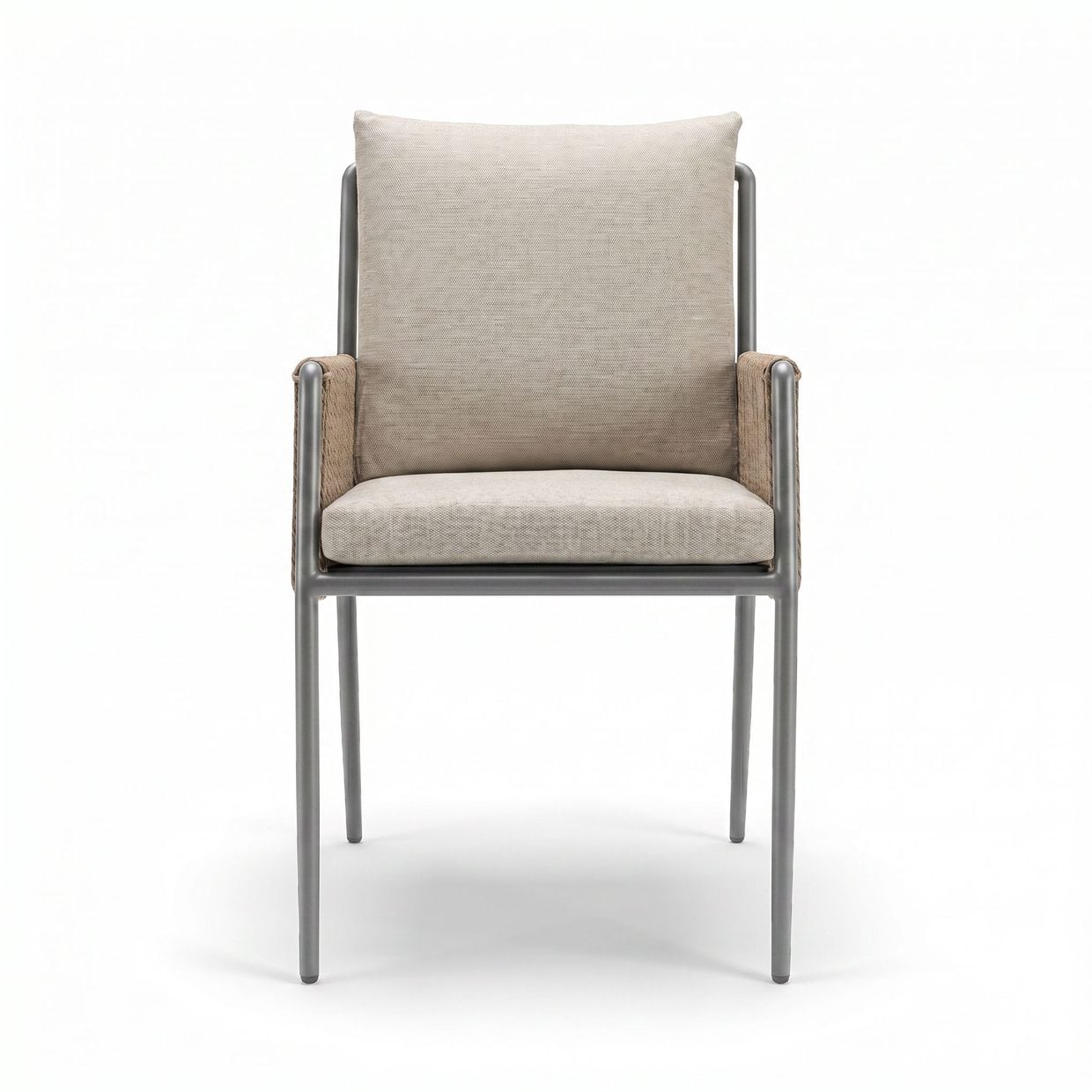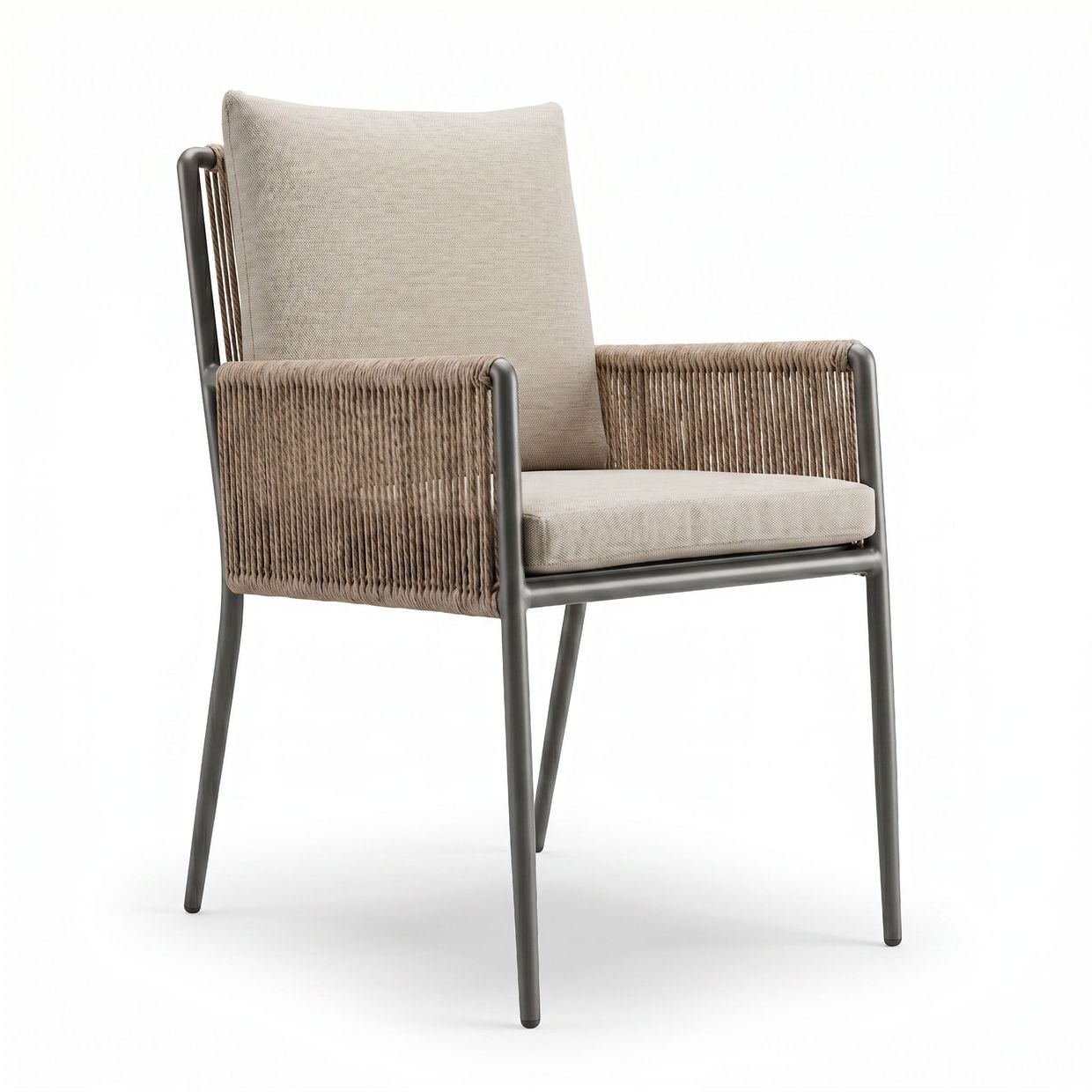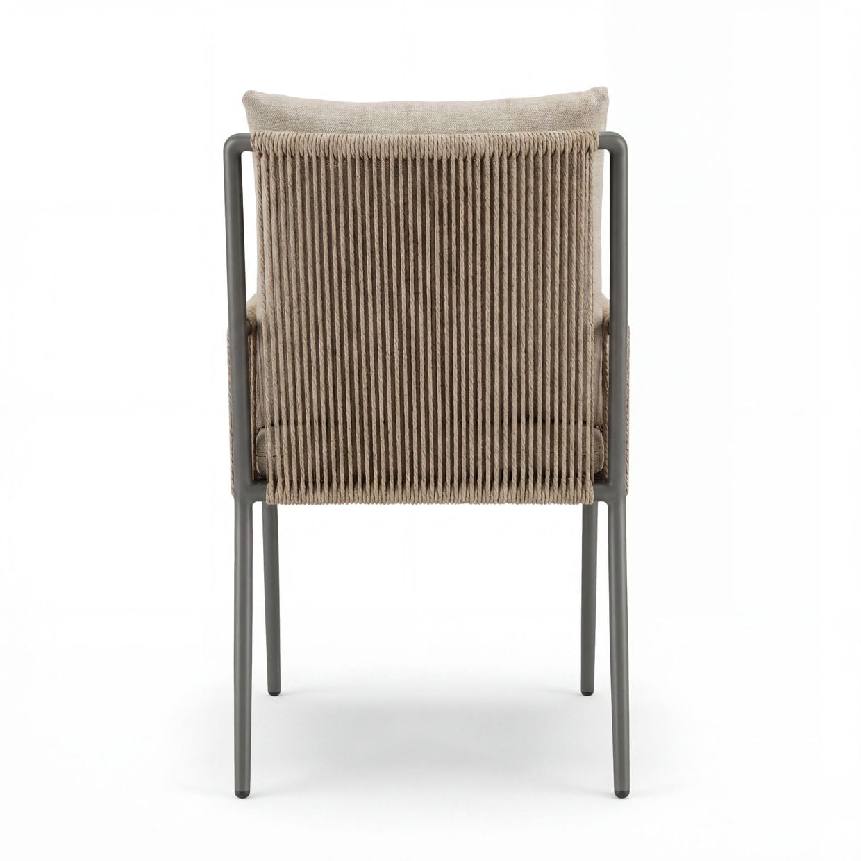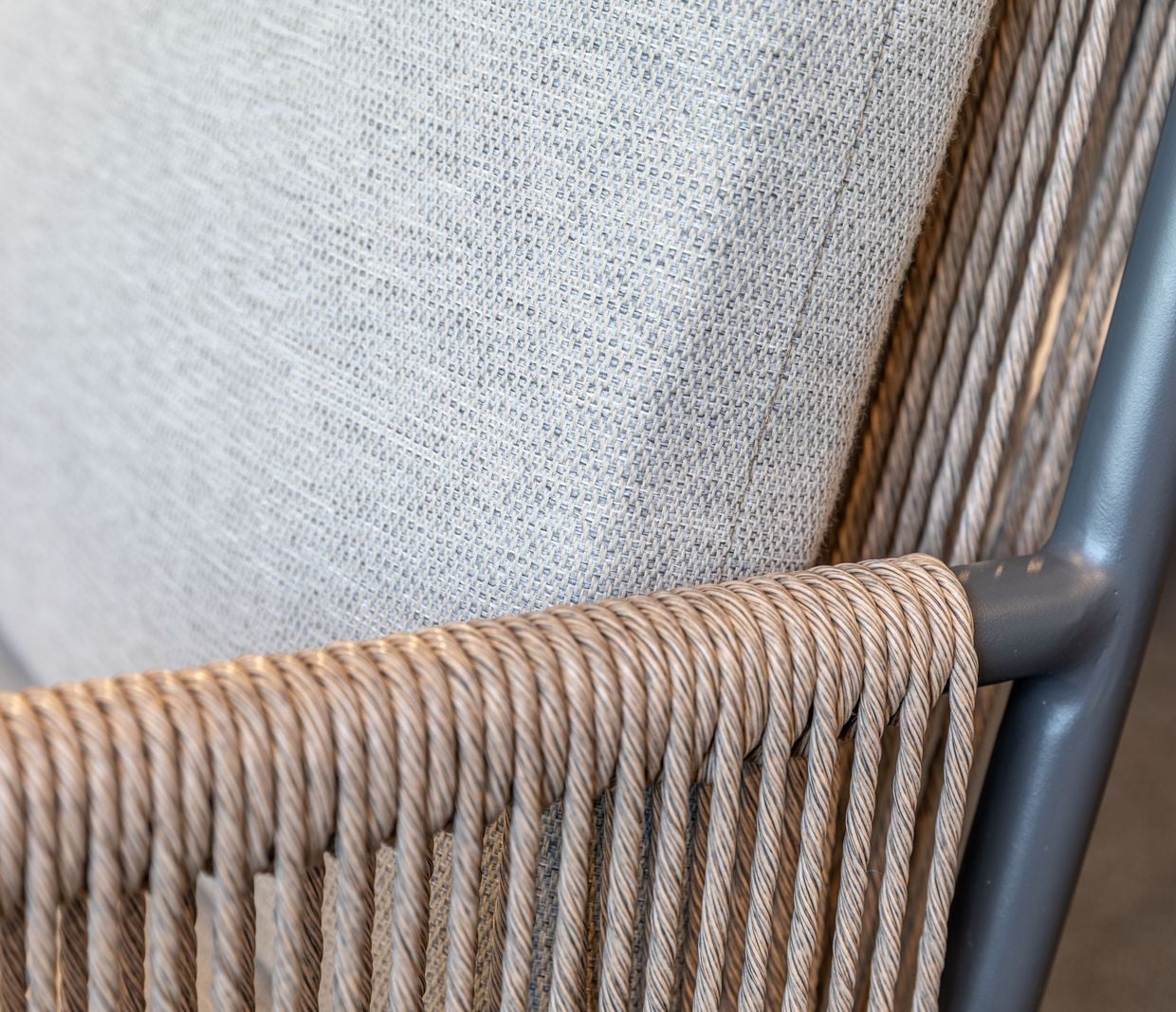 Armstöd och rygg är omsorgsfullt klädda i ett handvävt rep av slitstark, väderbeständig syntetfiber, vilket ger stolen ett exklusivt och inbjudande uttryck samtidigt som det kräver minimalt underhåll.