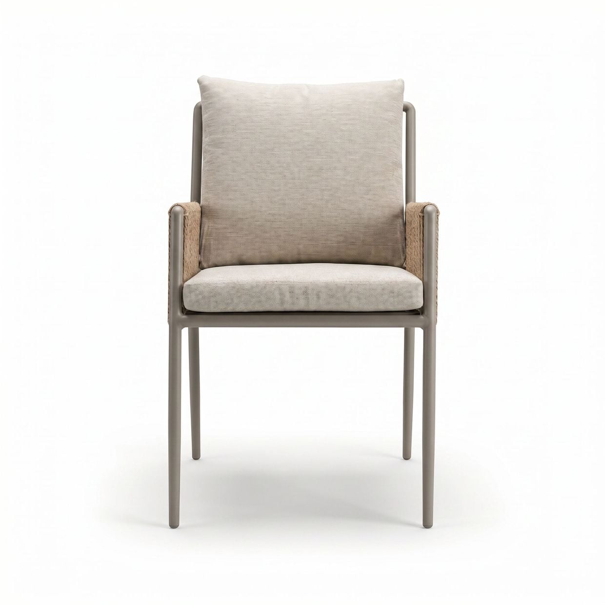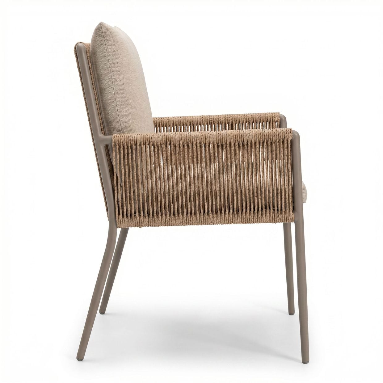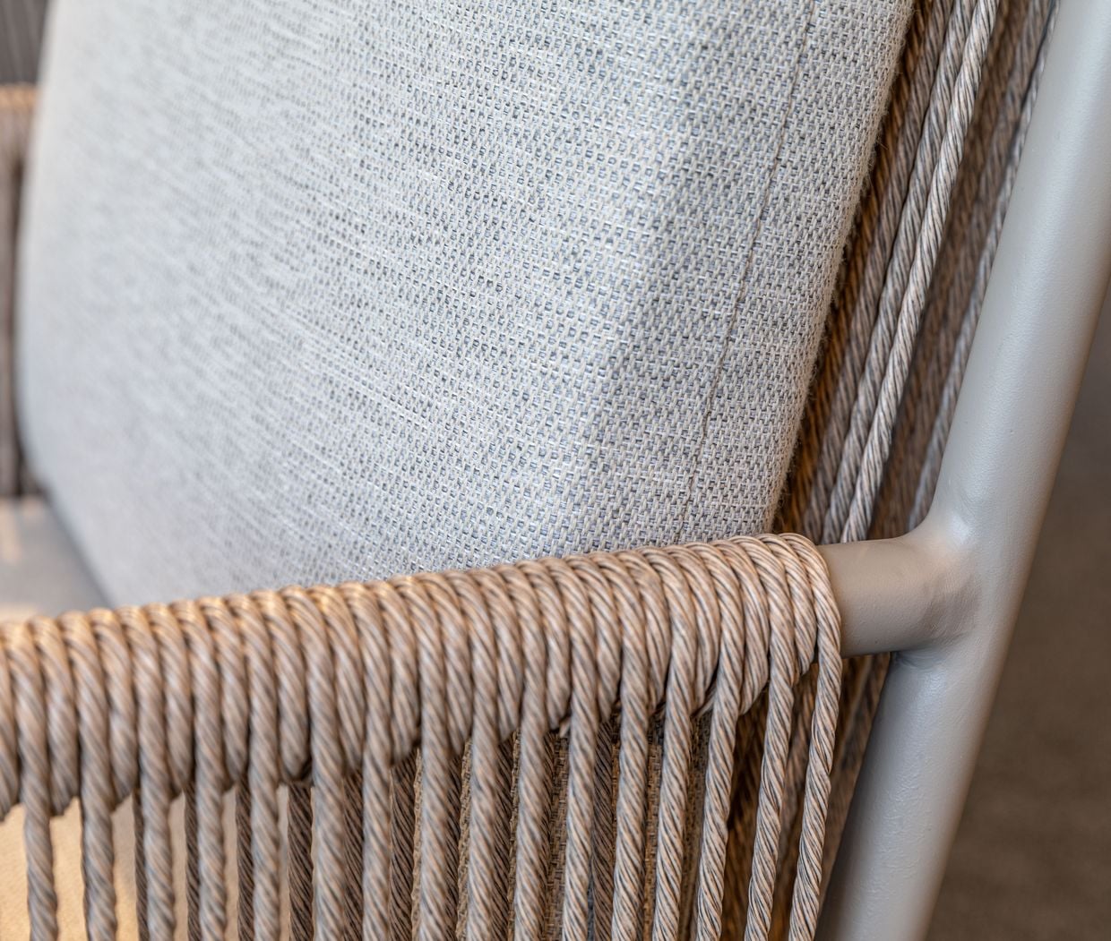 Armstöd och rygg är omsorgsfullt klädda i ett handvävt rep av slitstark, väderbeständig syntetfiber, vilket ger stolen ett exklusivt och inbjudande uttryck samtidigt som det kräver minimalt underhåll.