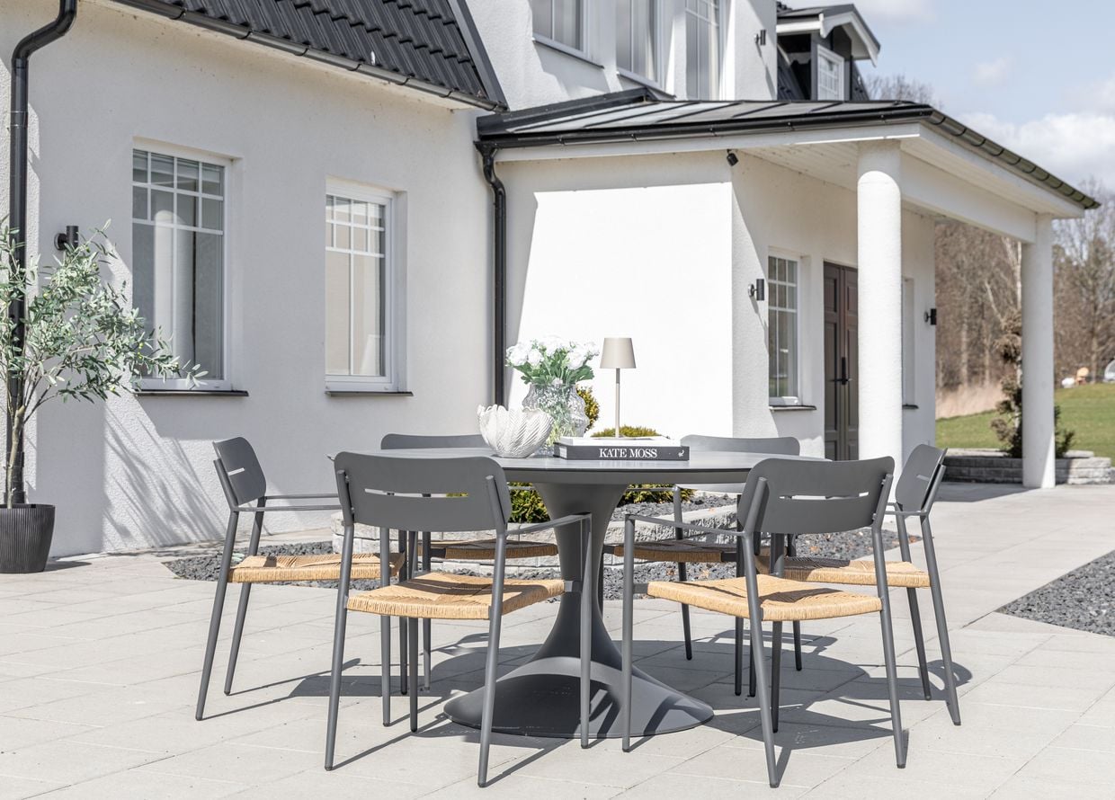 Ge uteplatsen ett lyft med vår stilrena matgrupp med det runda Tropez matbordet (Ø150 cm) och sex matchande Prato stolar.