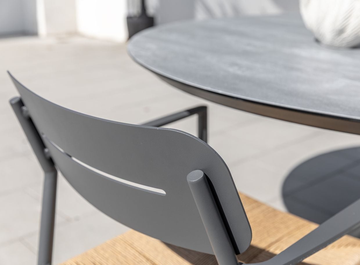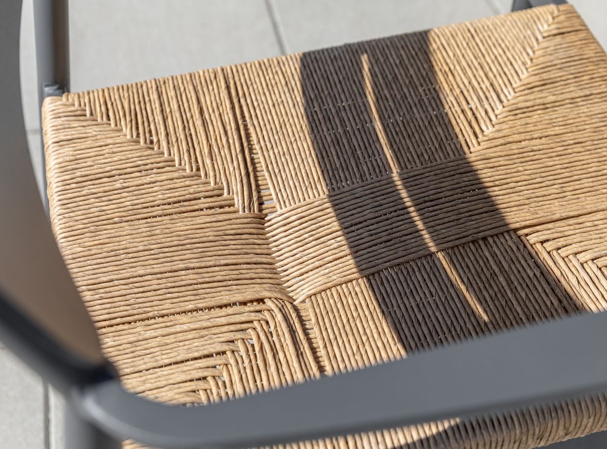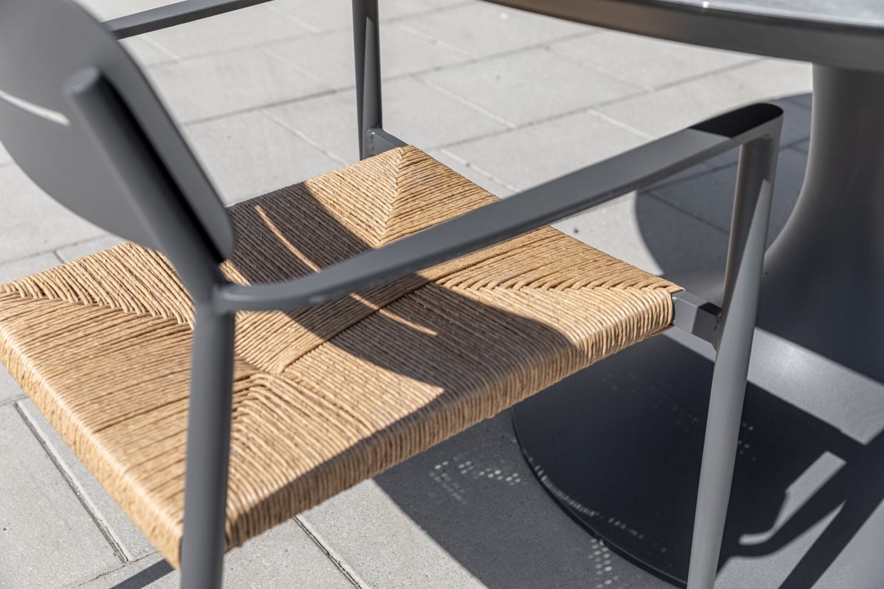 Prato stolarna är tillverkade i lätt men hållbart aluminium, med sits i handflätad konstrotting som ger en varm, naturlig känsla.