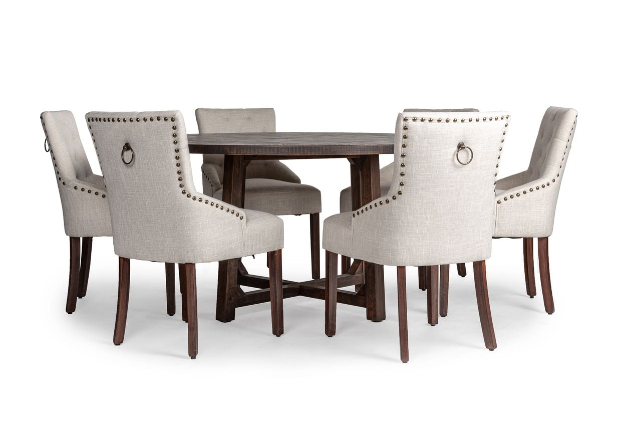 Tuva är en rustik serie i mörkbetsad, återvunnen furu. I serien finns matbord och sideboard i två olika storlekar samt en tygstol i linnekaraktär med handtag i ryggen. Bordsskivan har mindre märken och skruvhål som är charmen med ett återvunnet material.