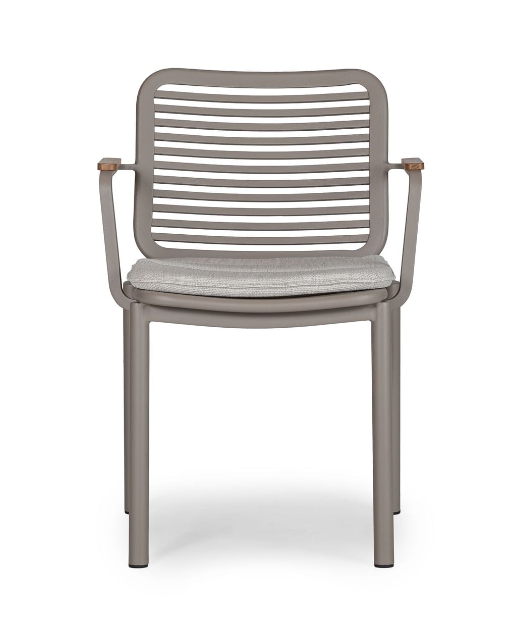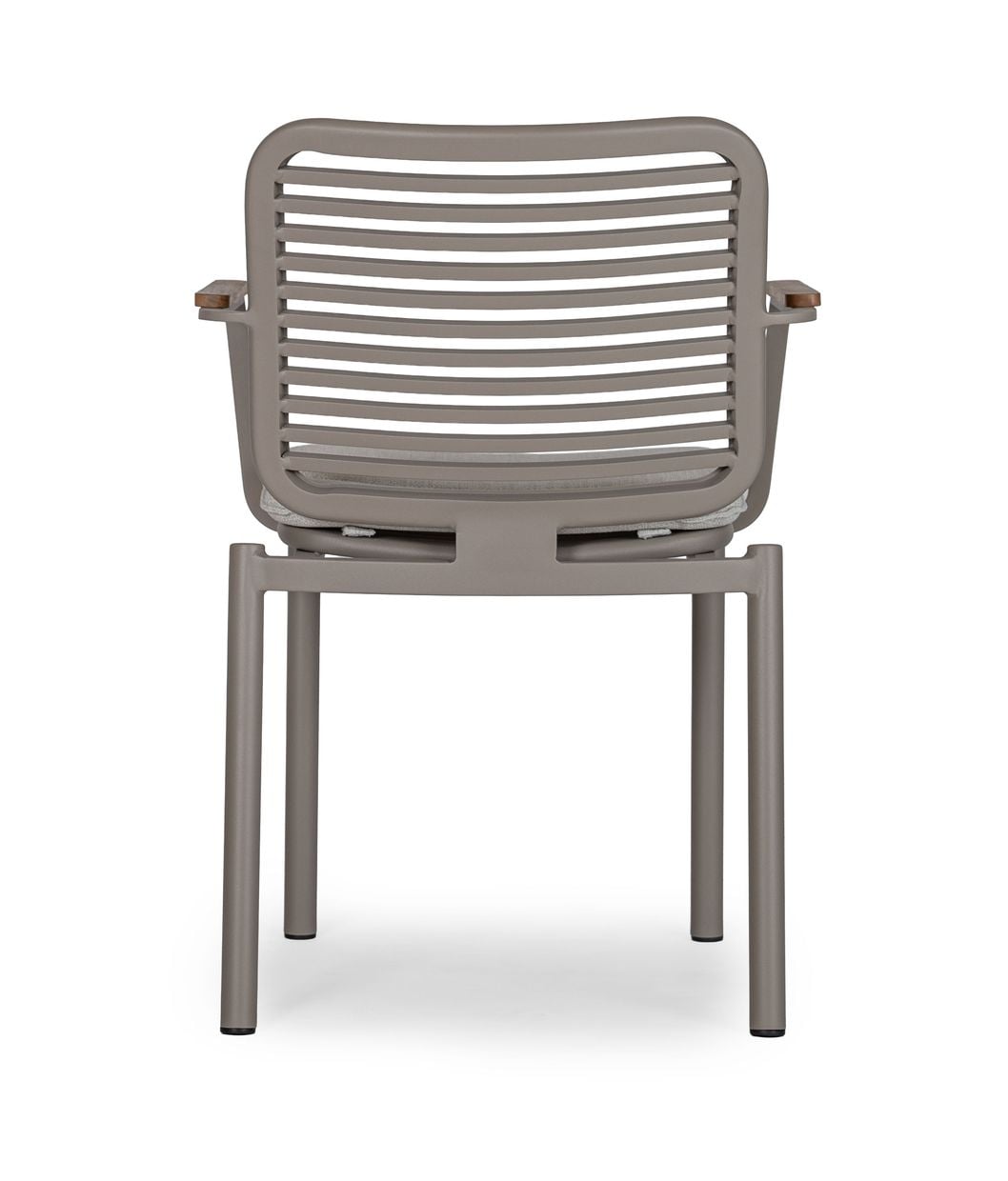 Stolen är tillverkad i slitstark aluminium och lackerad i vår egenutvecklade kulör nordisk beige – en varm och harmonisk ton som enkelt matchar andra möbler och skapar en enhetlig helhet. Armstöden är försedda med detaljer i teak som tillför en naturlig känsla och en exklusiv finish.