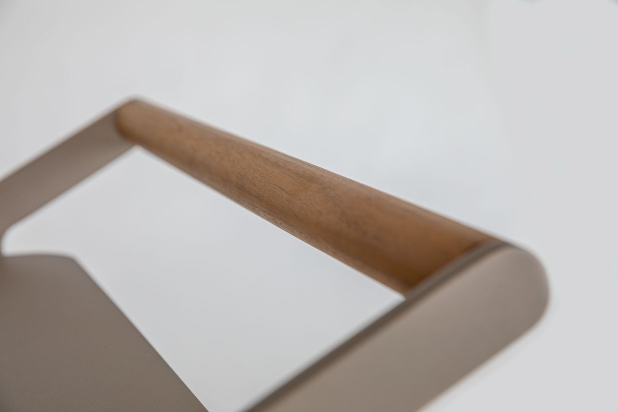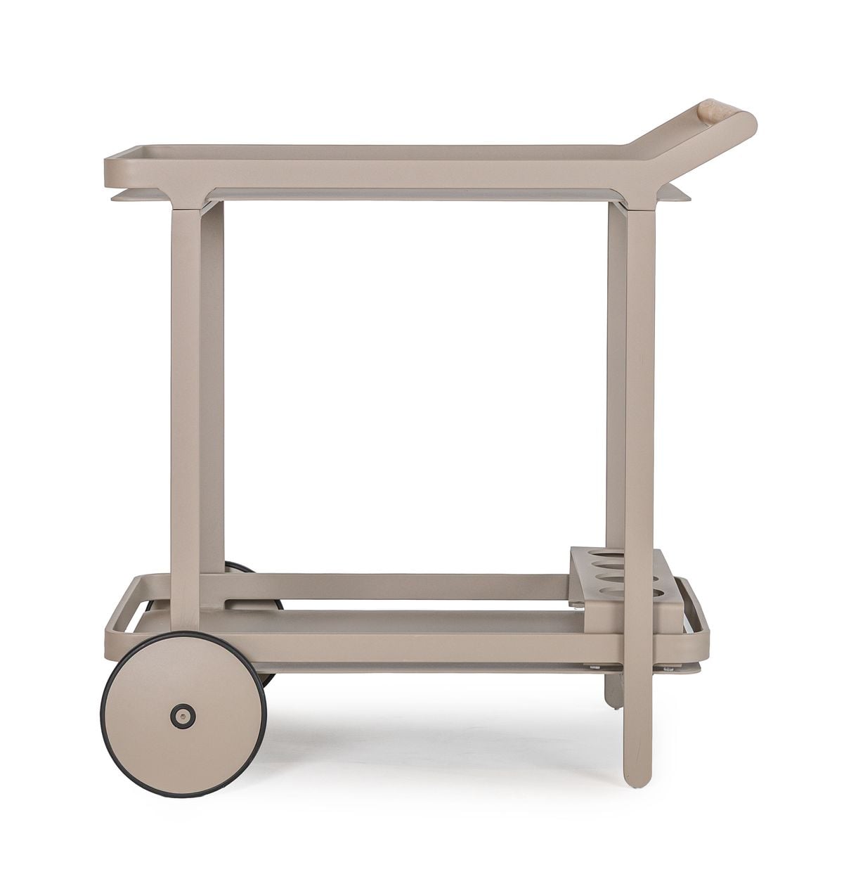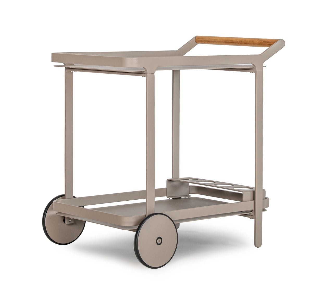 Vagnen är tillverkad i slitstark aluminium och lackerad i vår egen kulör nordisk beige, vilket ger ett harmoniskt och modernt uttryck som matchar övriga möbler i serien. Handtaget är försett med en detalj i teak som tillför en varm och naturlig kontrast.