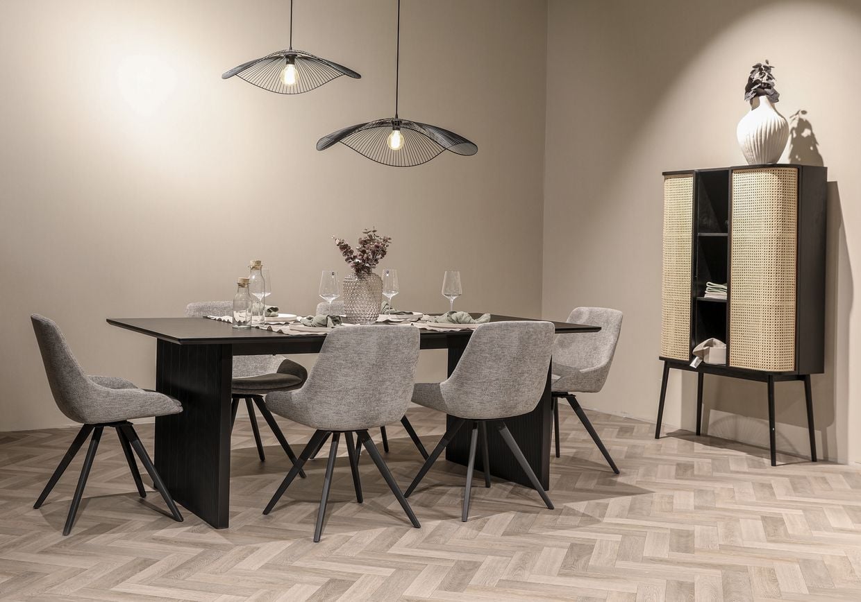 Stolarna Amaris tar komforten till en ny nivå. Med sin 360-graders snurrfunktion ger de både flexibilitet och en känsla av lyx. Klädda i ett mjukt, grått tyg och med en ergonomisk design erbjuder stolarna maximal bekvämlighet, samtidigt som de utstrålar modern elegans. De svarta metallbenen skapar en stilfull kontrast och säkerställer stabilitet.