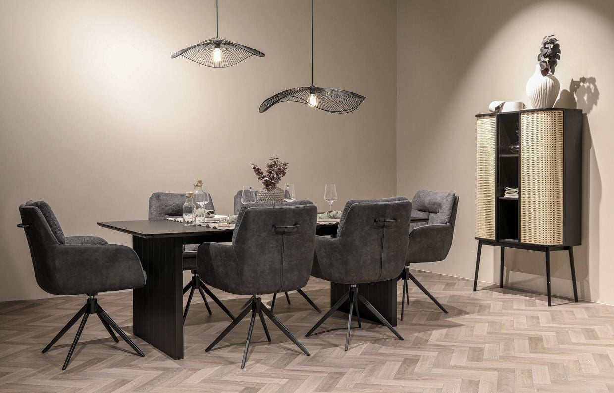 Stolarna Gustav tar komfort och innovation till en ny nivå med sin 360-graders snurrfunktion och praktiska autoreturn-funktion. Klädda i ett mjukt och hållbart grått tyg, kombinerar de hög komfort med en modern estetik. De robusta svarta metallbenen ger både stabilitet och en snygg kontrast till det mjuka sitsmaterialet. Den ergonomiska utformningen, tillsammans med armstöd och ryggstöd, gör stolen perfekt för långa och bekväma middagar.